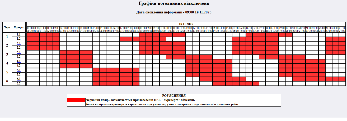 Графіки відключення світла на сьогодні, 18 листопада