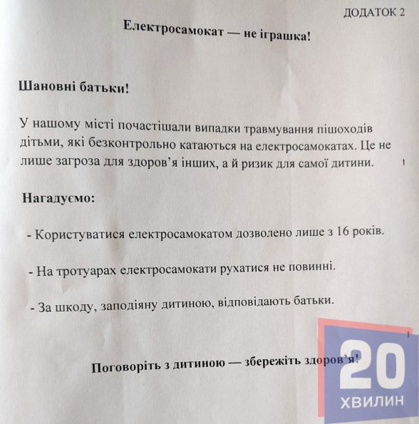 - заборонити рух електросамокатів у місцях масового скупчення людей — центрі міста, біля шкіл, садочків, у парках;