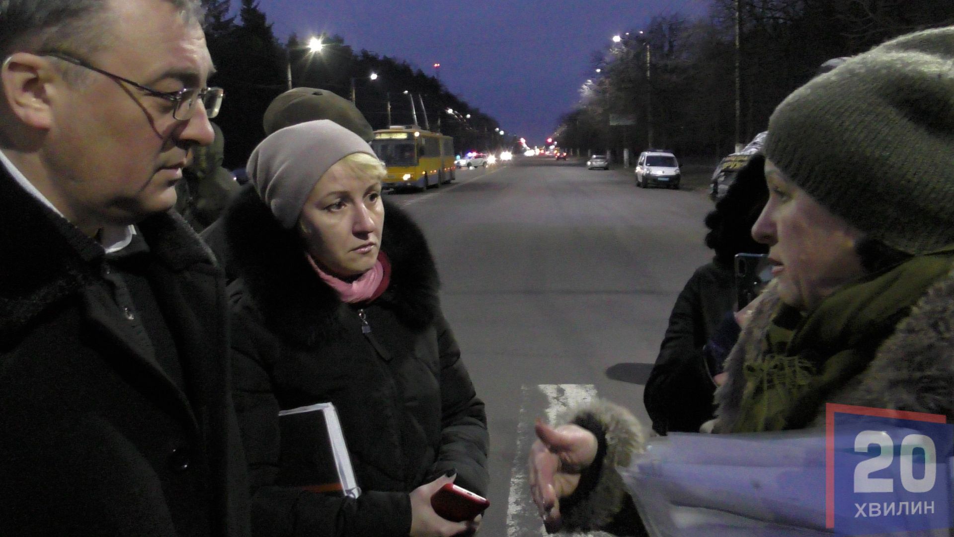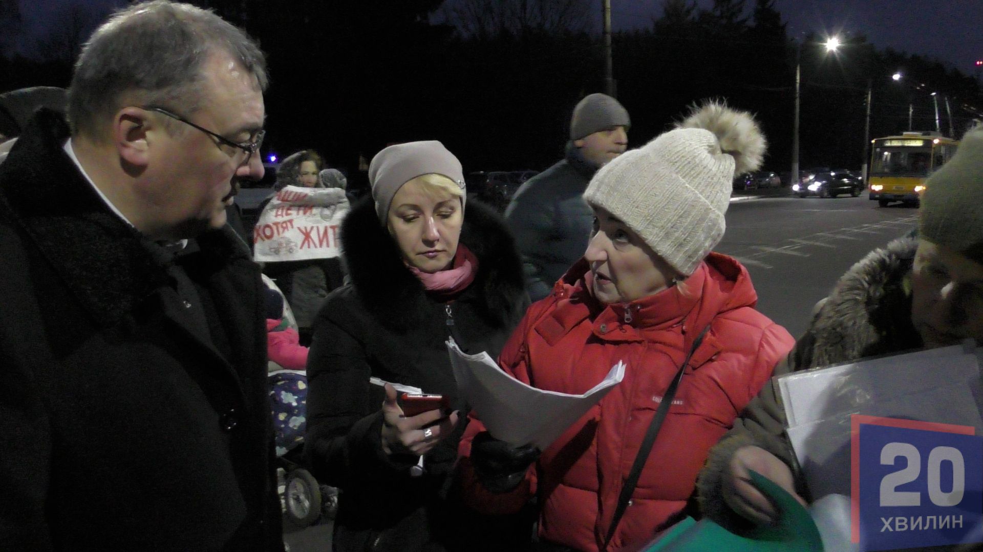Поспілкуватися з протестуючими прибули співробітник управління культури і туризму Житомирської обласної адміністрації Олександр Пивоварський, керівник житомирського відділу поліції Сергій Крошко та представник управління екології Житомирської обласної державної адміністрації.