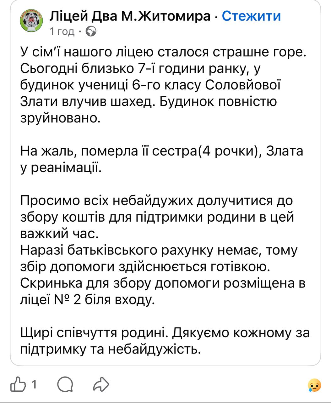 Ліцей № 2 Житомира оголосив збір коштів для родини учениці 6-го класу Злати Соловйової, яка втратила сестричку і будинок внаслідок влучання шахеда