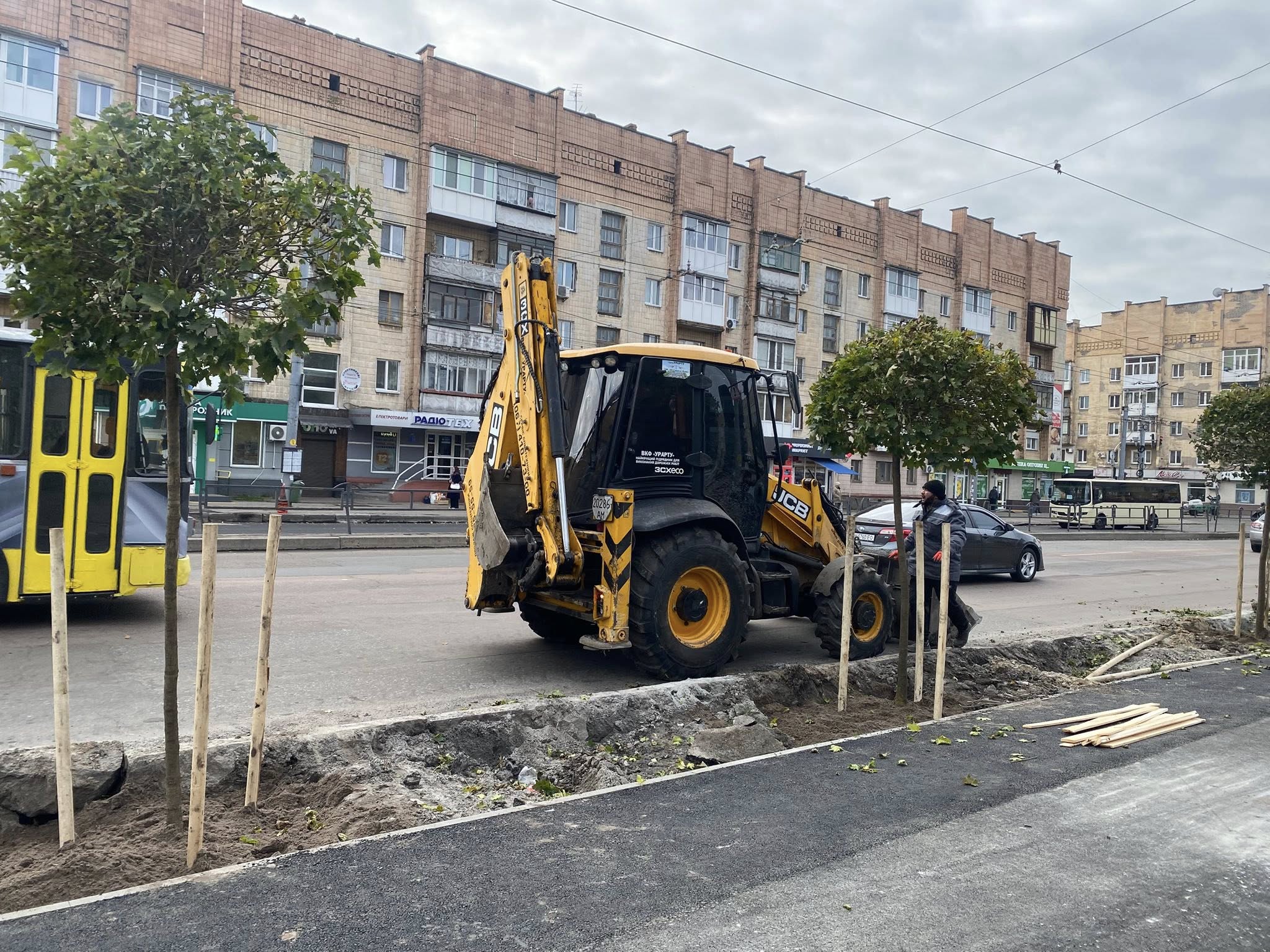 Біля торгового центру «Ярмарок» працівники КП «Зеленбуд» розпочали висадку дерев уздовж дороги.