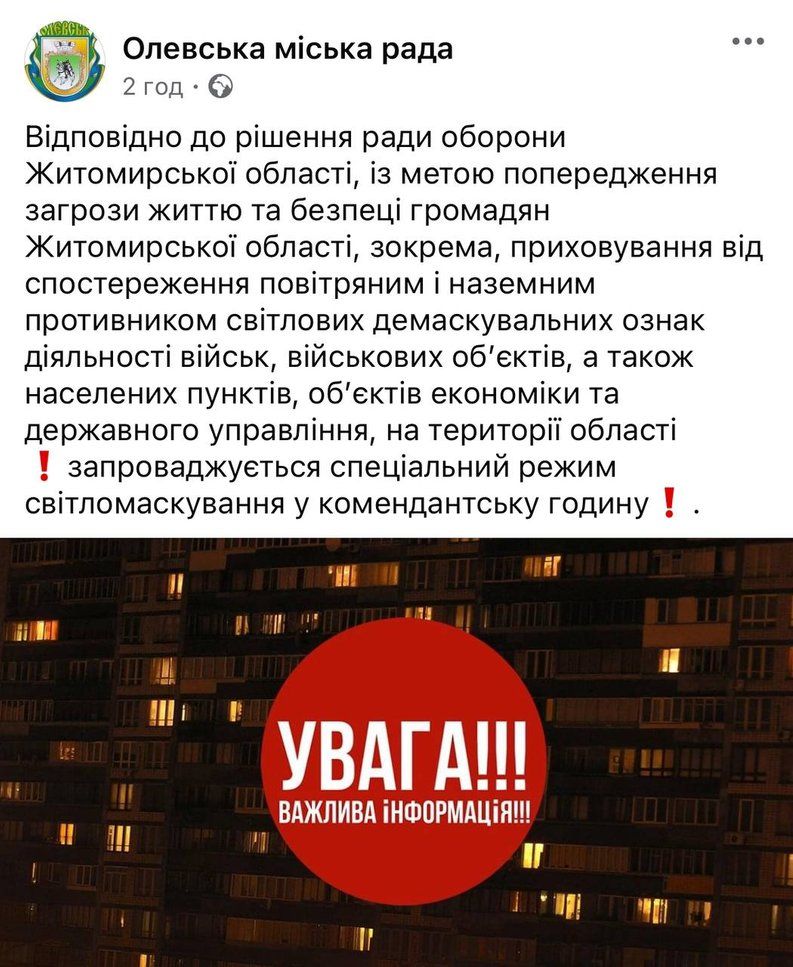 "Відповідно до рішення ради оборони Житомирської області, із метою попередження загрози життю та безпеці громадян Житомирської області, зокрема, приховування від спостереження повітряним і наземним противником світлових демаскувальних ознак діяльності військ, військових об'єктів, а також населених пунктів, об'єктів економіки та державного управління, на території області запроваджується спеціальний режим світломаскування у комендантську годину", — йдеться у повідомленні.
