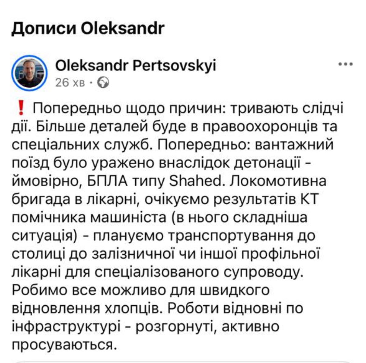 Як пізніше повідомив голова правління АТ «Укрзалізниця» Олександр Перцовський, вантажний поїзд було уражено внаслідок детонації БпЛА.