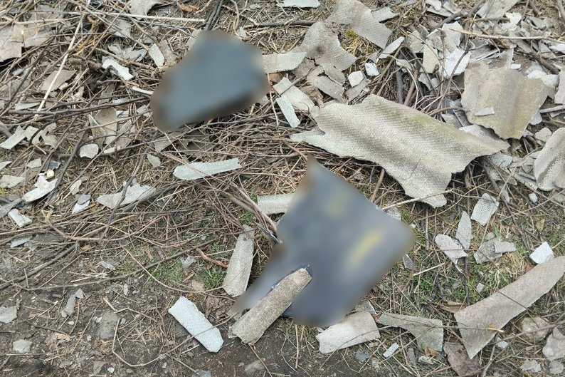 Уламки "шахеда" серед розбитого шиферу. Житомир, 31 березня 2025 року. Суспільне Житомир/Леонід Харшан