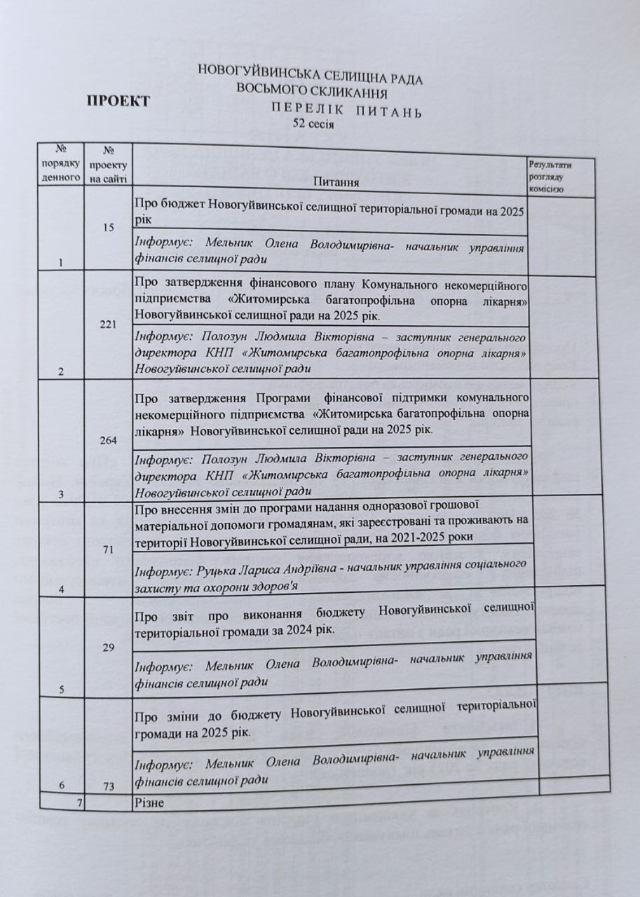 Зокрема на сесії мають розглянути питання бюджету, фінансування Житомирської багатопрофільної опорної лікарні Новогуйвинської селищної ради і виідлення допомоги на потреби постраждалих від російської атаки в селищі Озерному.