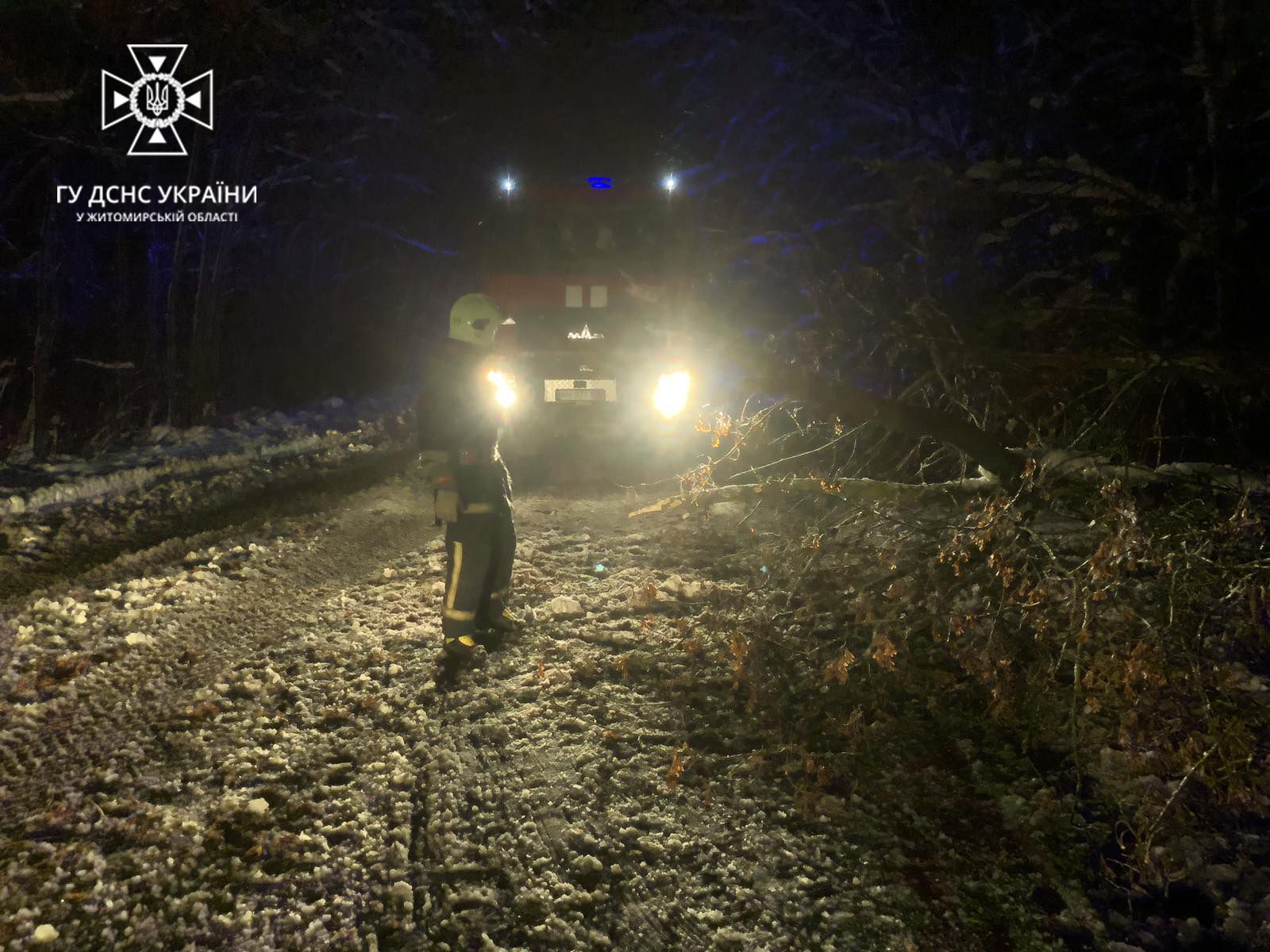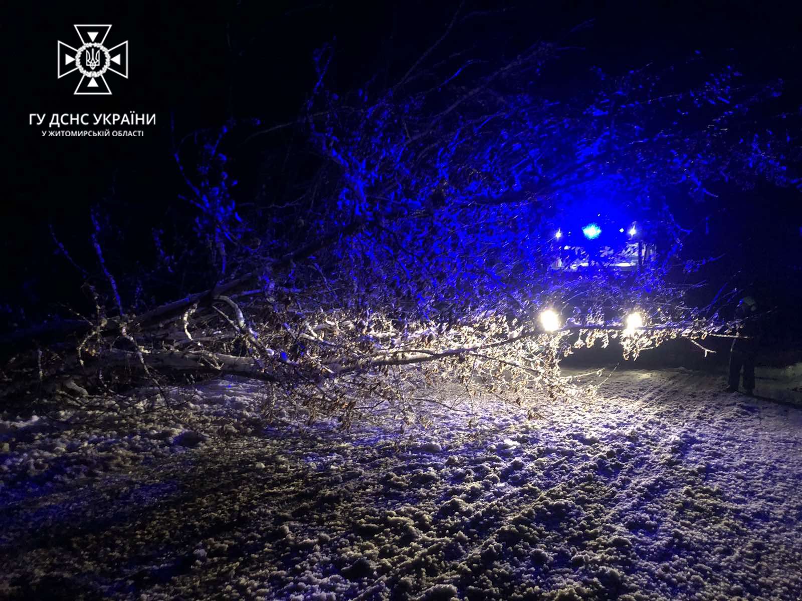 До того ж з автошляхів у с. Кикова Звягельського району, поблизу сіл Пряжів, Тетерівка і Будичани Житомирського району та біля с. Рея Бердичівського району бійці ДСНС розрізали та прибрали на узбіччя проїжджих частин 25 дерев. Ймовірно, опади у вигляді снігу та температурні стрибки створили сильне навантаження на крони дерев, через що їх коріння не витримало надмірної ваги і вони попадали. Це, своєю чергою, призвело до заторів.
