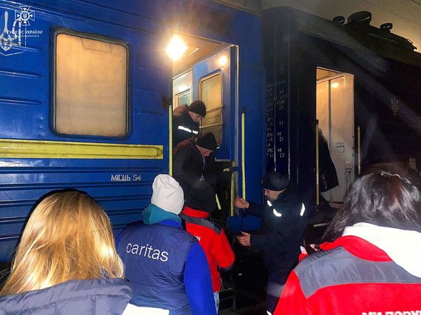 На вокзалі вимушених переселенців зустріли рятувальники, поліцейські, представники органів влади, благодійної організації «Карітас України» та Товариства Червоного Хреста України.