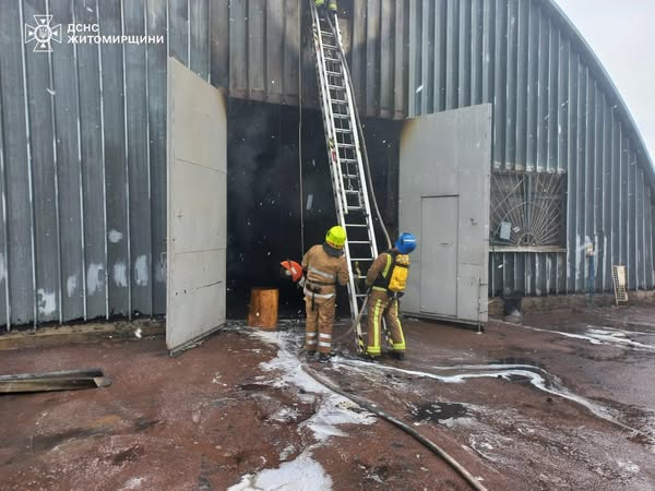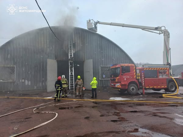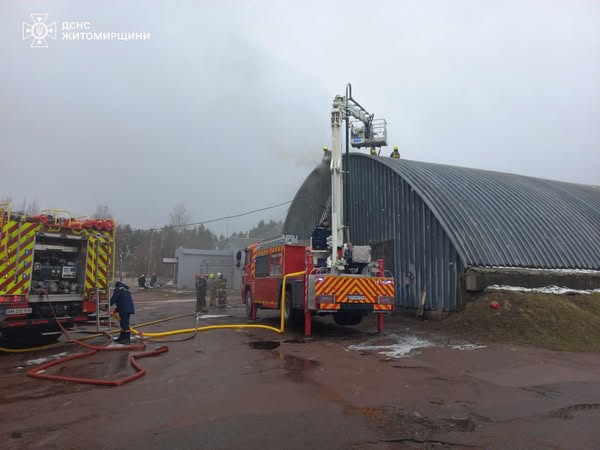 У Коростені рятувальники гасять пожежу в металевому ангарі