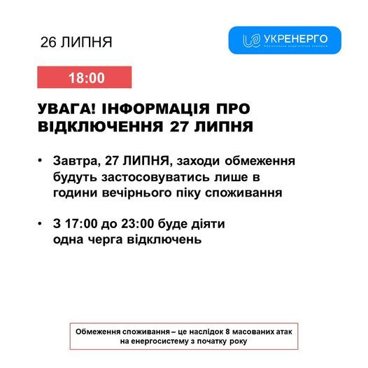 У суботу відключення електрики відбуватимуться лише в години вечірнього піку споживання 20 хвилин (Житомир) share 1 chat_bubble 0 visibility 187 Про це повідомляє Укренерго. Слідкуйте за новинами Житомира у Facebook, Telegram, Instagram та YouTube. Дізнавайтесь про новини швидше! Додай 20 хвилин собі на екран Встановити Коментарі Опублікувати коментар