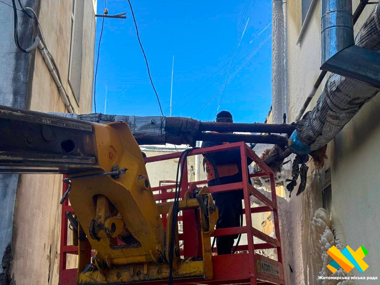 «В аварійному режимі замінюємо ділянку труби. Для цього довелося злити воду з будинку. При такій температурі вода замерзає буквально на ходу — на фасаді утворилися обмерзлі брили льоду», — розповідає майстер дільниці №4 КП «Житомиртеплокомуненерго» Андрій Гуторович.