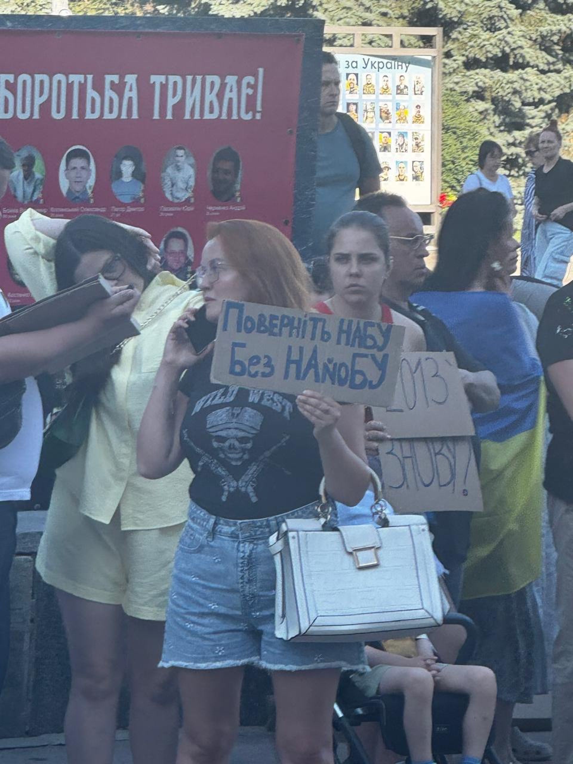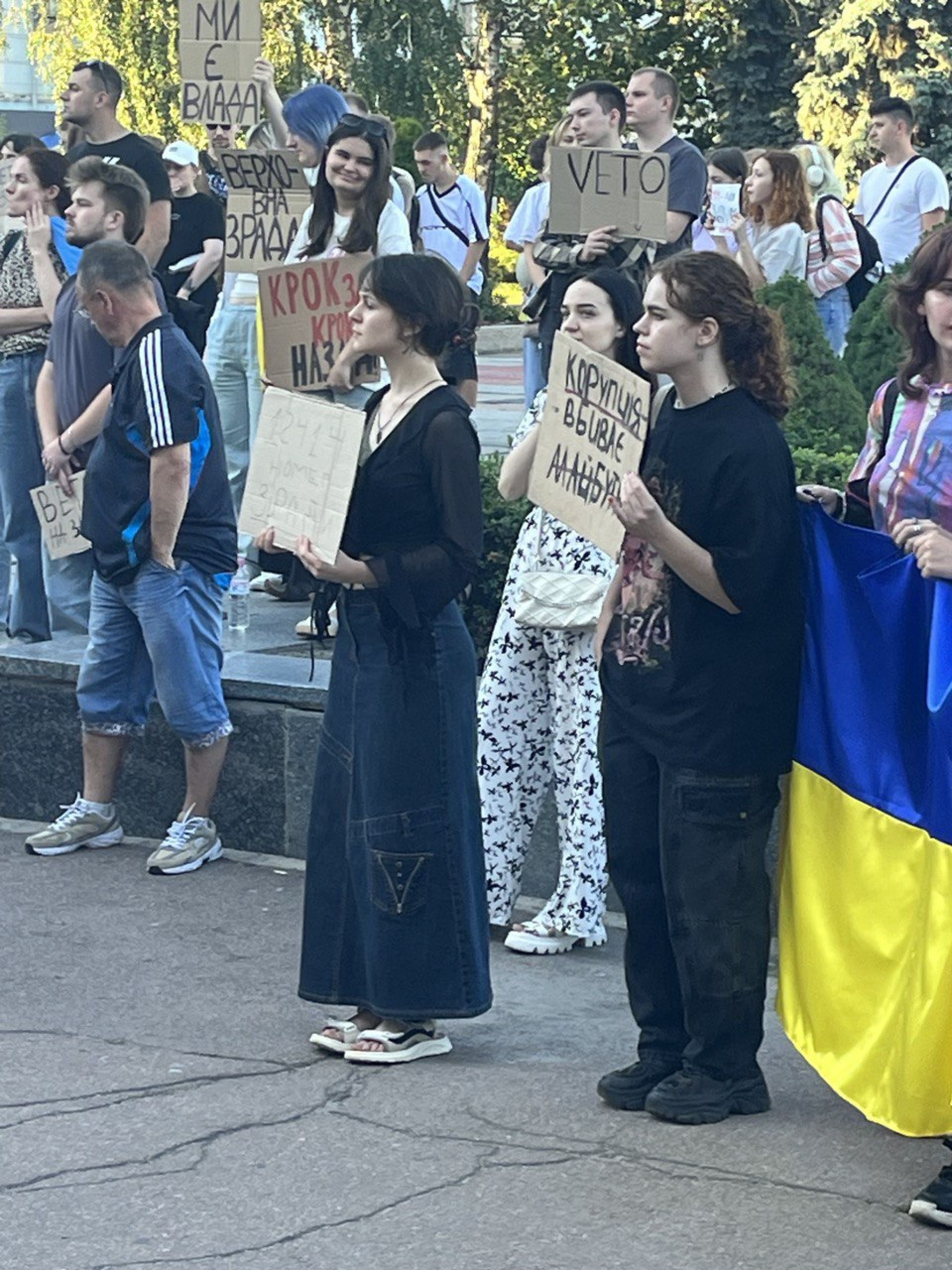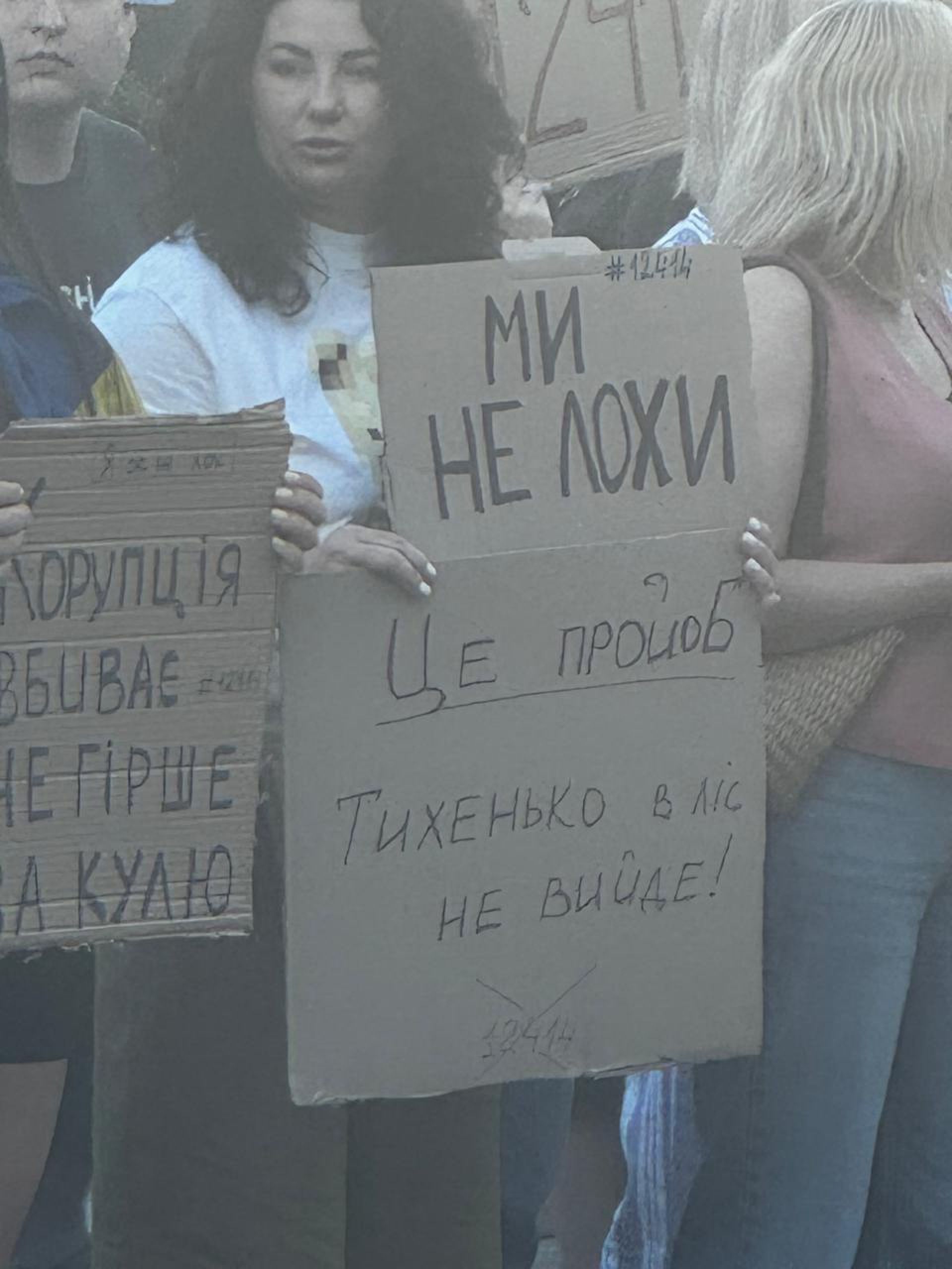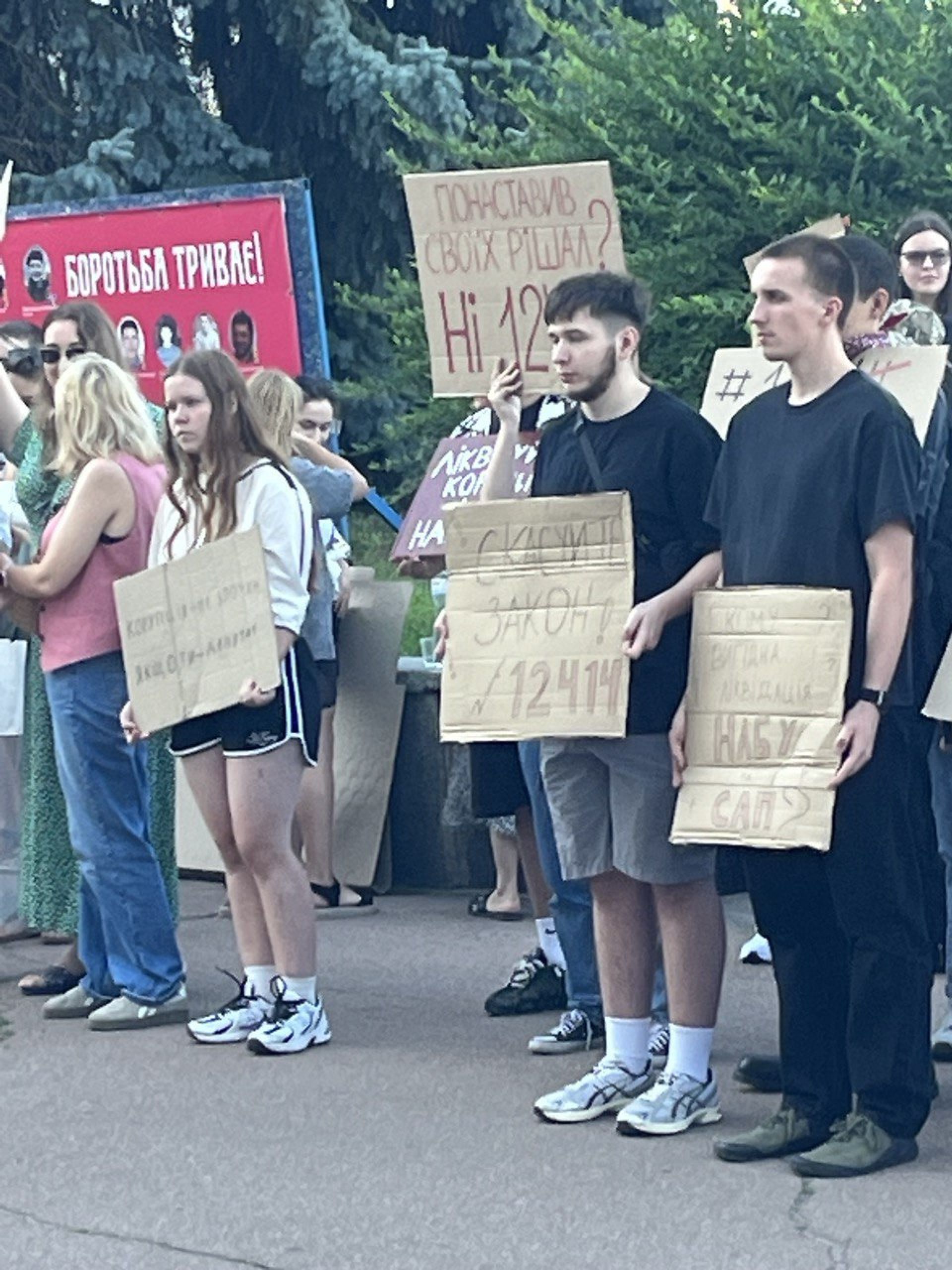У Житомирі 23 липня 2025 року на майдані біля Житомирської обласної військової адміністрації зібралися десятки небайдужих містян, аби висловити свій протест проти ухваленого напередодні законопроєкту №12414, який, на думку громадськості, де-факто позбавляє незалежності головні антикорупційні органи держави — НАБУ та САП.