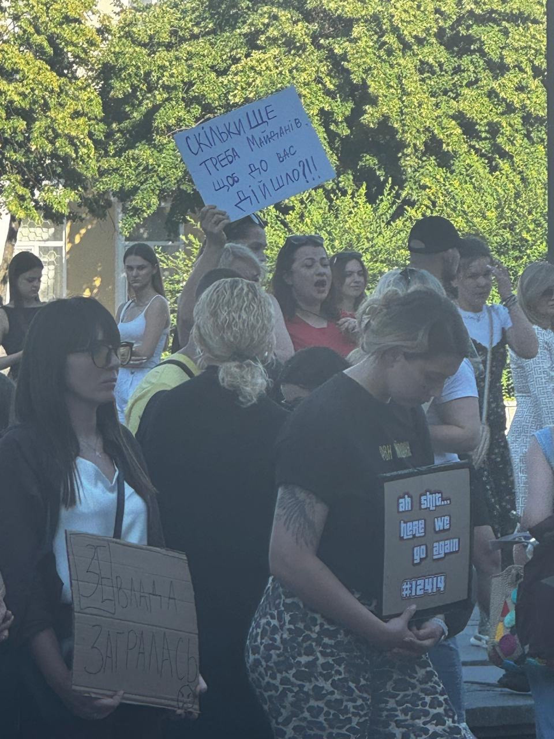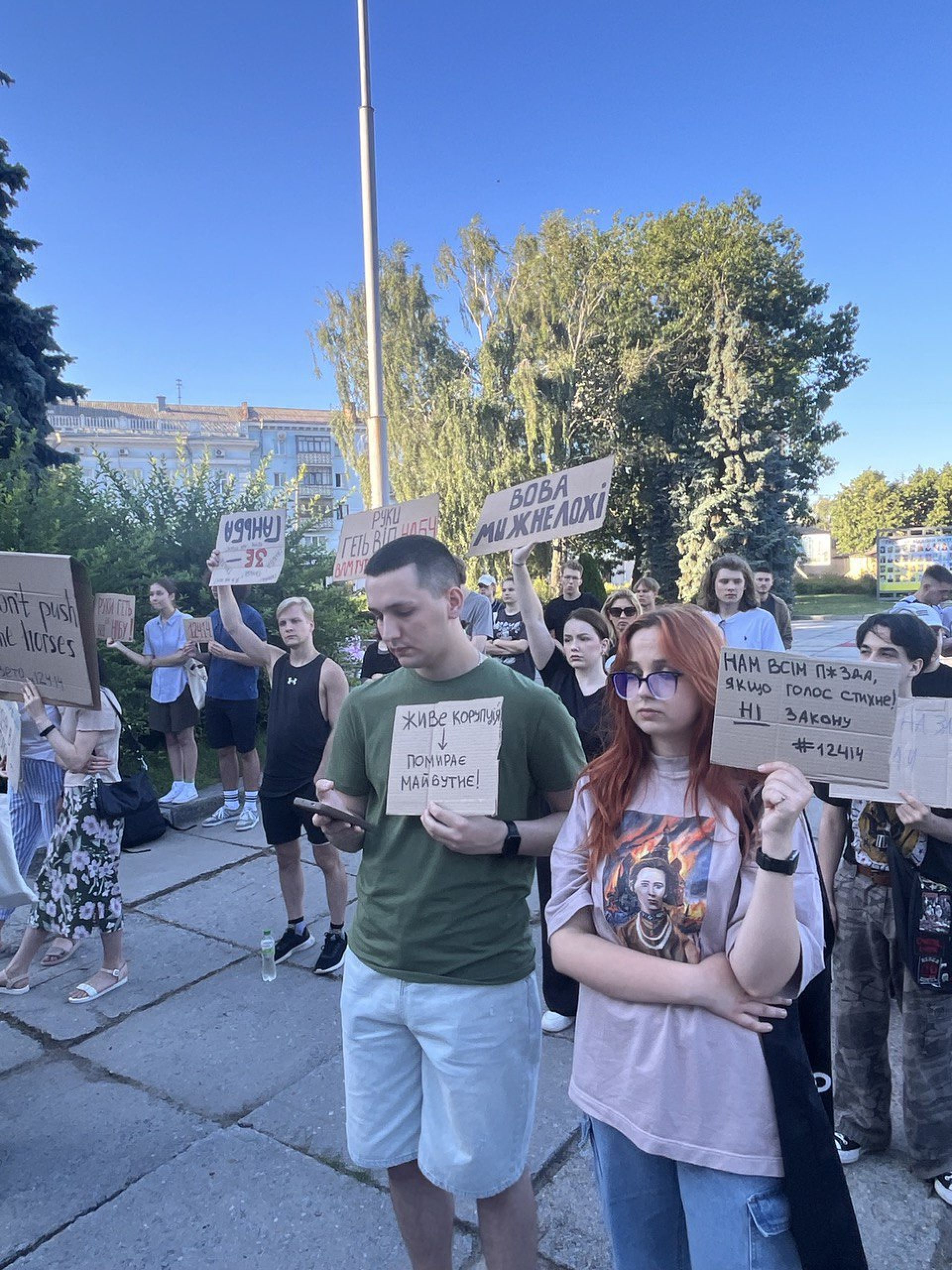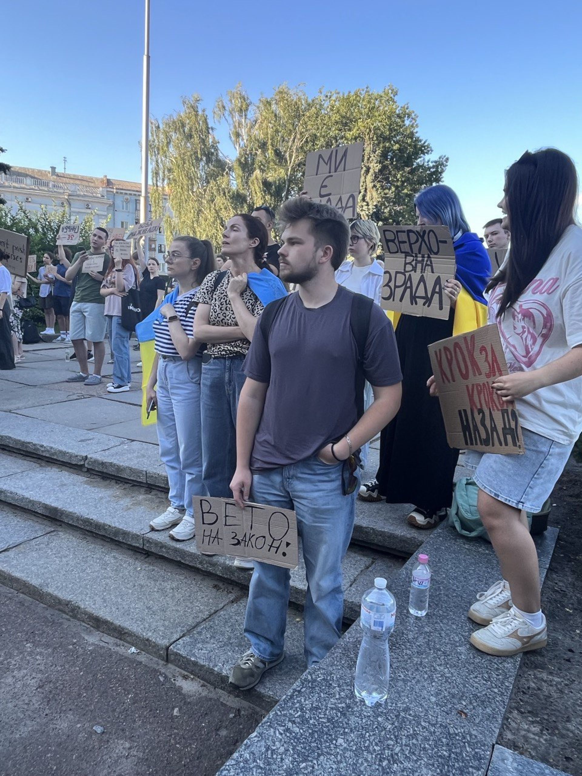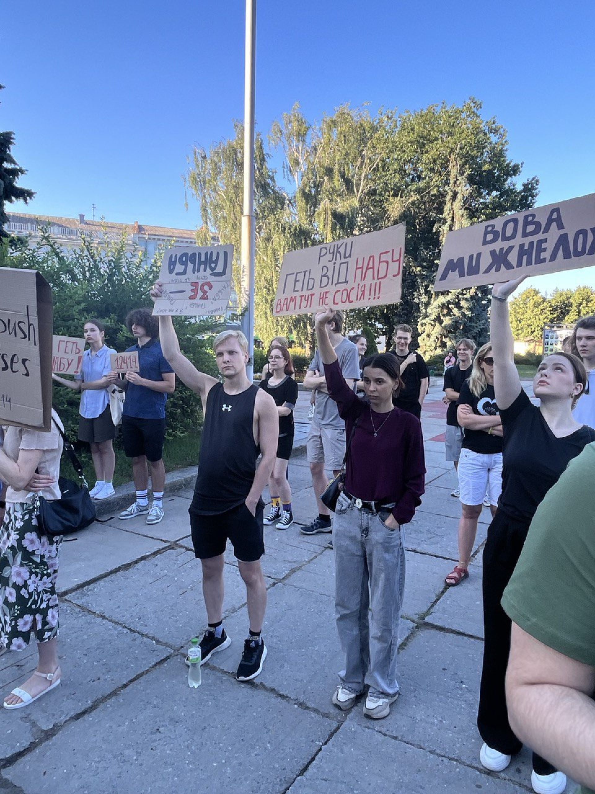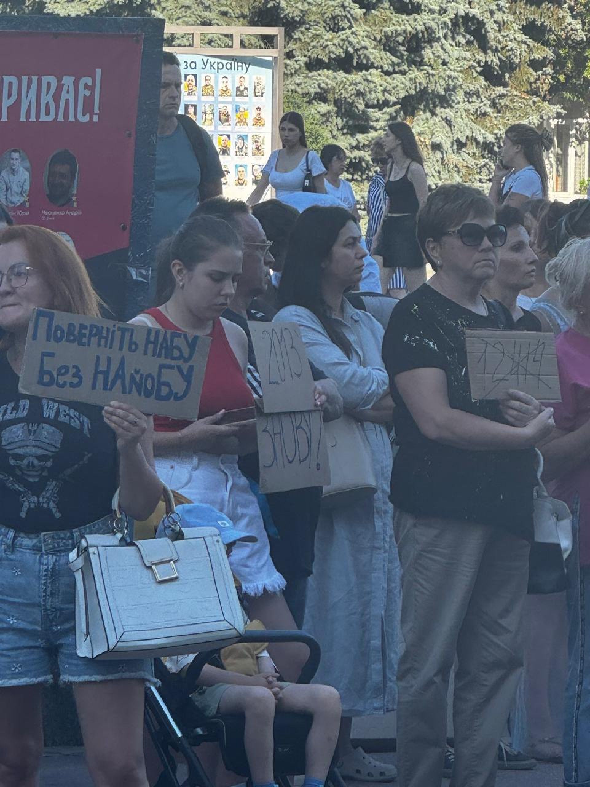 У Житомирі 23 липня 2025 року на майдані біля Житомирської обласної військової адміністрації зібралися десятки небайдужих містян, аби висловити свій протест проти ухваленого напередодні законопроєкту №12414, який, на думку громадськості, де-факто позбавляє незалежності головні антикорупційні органи держави — НАБУ та САП.