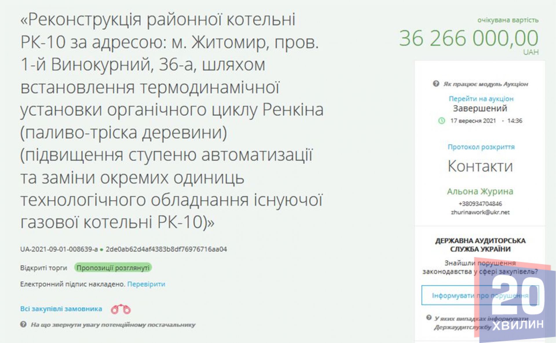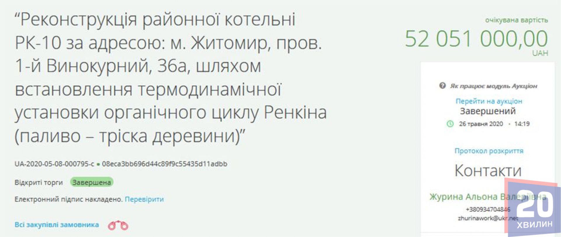 Досліджуючи документи тендера, ми можемо переконатися у тих же самих вимогах, що й у попередній тендерній документації. Крім того, вказано, що підрядник має зробити повний комплекс робіт з реконструкції автоматизації та здійснити певні заходи щодо організації теплопостачання. Це дуже дивно, але це вже третя закупівля з реконструкції котельні РК-10. Комунальне підприємство «Житомиртеплокомуненерго» у травні 2020 року провело тендер на реконструкцію районної котельні РК-10 через встановлення термодинамічної установки органічного циклу Ренкіна (паливо – тріска деревини). Перемогу у тендері отримало ТОВ «Спецтермомонтаж-Енерго». У червні 2020 року замовник та підрядник уклали угоду на 51,3 млн грн. Нагадуємо, що роботи мають бути виконані до 31 жовтня поточного року.