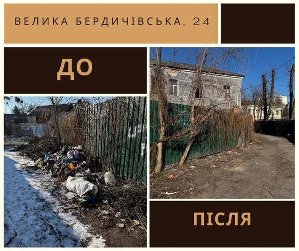 Окрім зазначених адрес, власником земельної ділянки по вул. Великій Бердичівській, 24 з-за технічної підтримки ТОВ «Грін Бін Україна» ліквідовано стихійне сміттєзвалище.