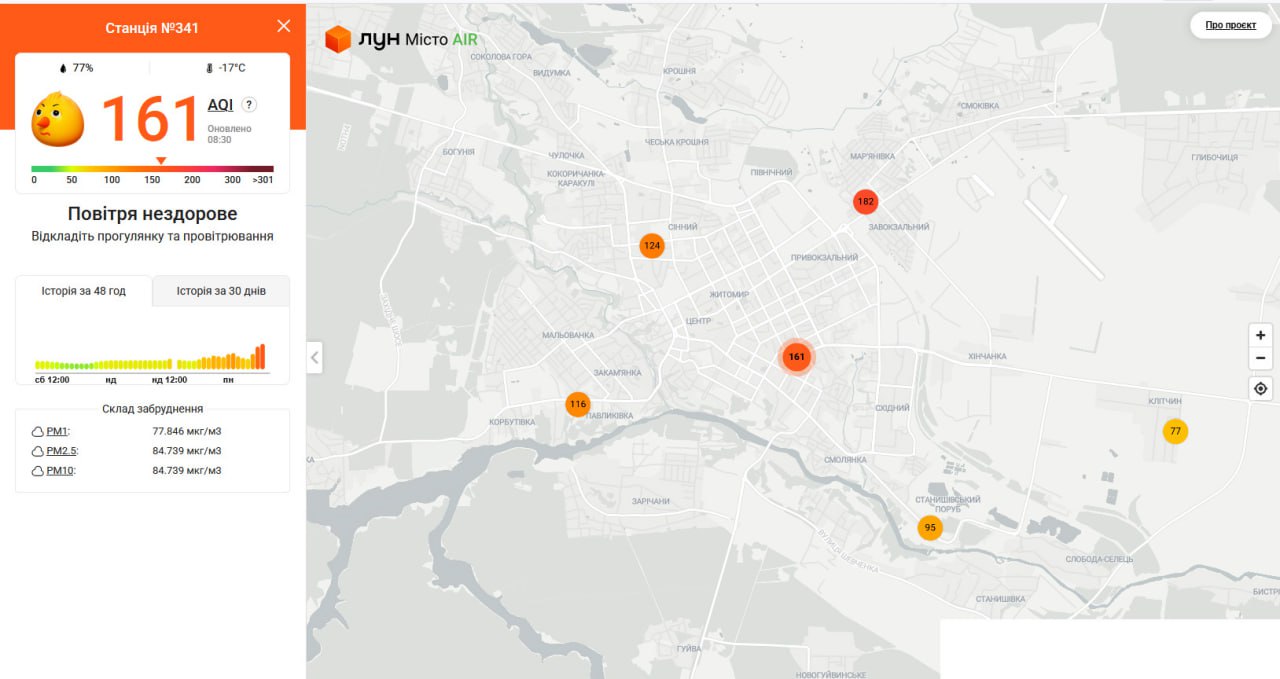 Дані станцій моніторингу якості повітря ЛУН свідчать: практично по всьому місту рівень забруднення досяг критичних показників, а в окремих районах — небезпечних для здоров’я. Найгірша ситуація спостерігається в центральній частині міста та в районах двох автовокзалів, де показники якості повітря суттєво перевищують норму. Житомир фактично опинився серед міст-лідерів України за рівнем забруднення атмосферного повітря.
