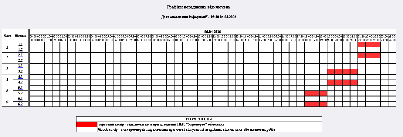 6 квітня за вказівкою НЕК "Укренерго" з 18:00 вводяться в дію графіки погодинних відключень. Перевірте ваш графік: