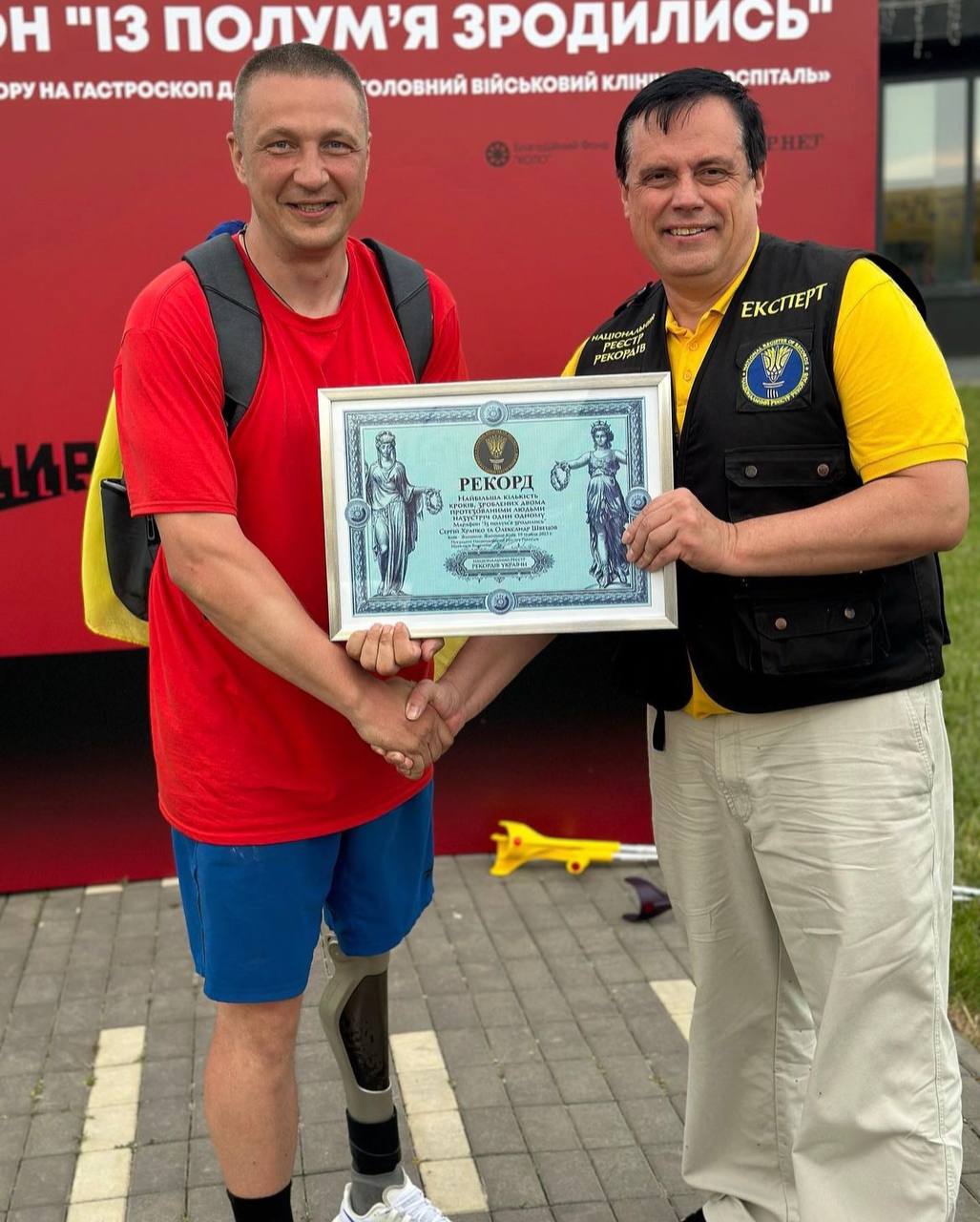 Ветеран АТО з Житомира Олександр Швецов разом із побратимом з Києва Сергієм Храпкоп, пройшовши назустріч один одному відстань у 120 км під час марафону "Із полум'я зродились", не лише зібрали близько 3 млн грн на гастроскоп для київського шпиталю, а й встановили рекорд.