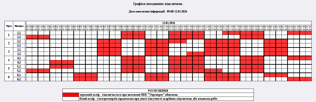 Відключення електрики на понеділок, 12 січня, — графіки