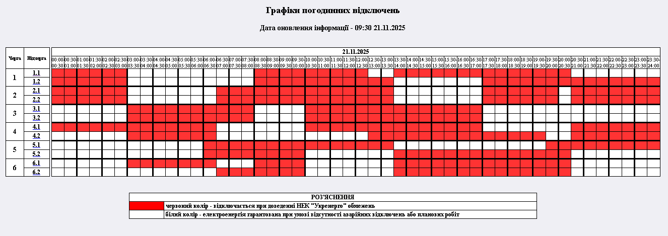 Відключення електроенергії на сьогодні, 21 листопада, — графіки