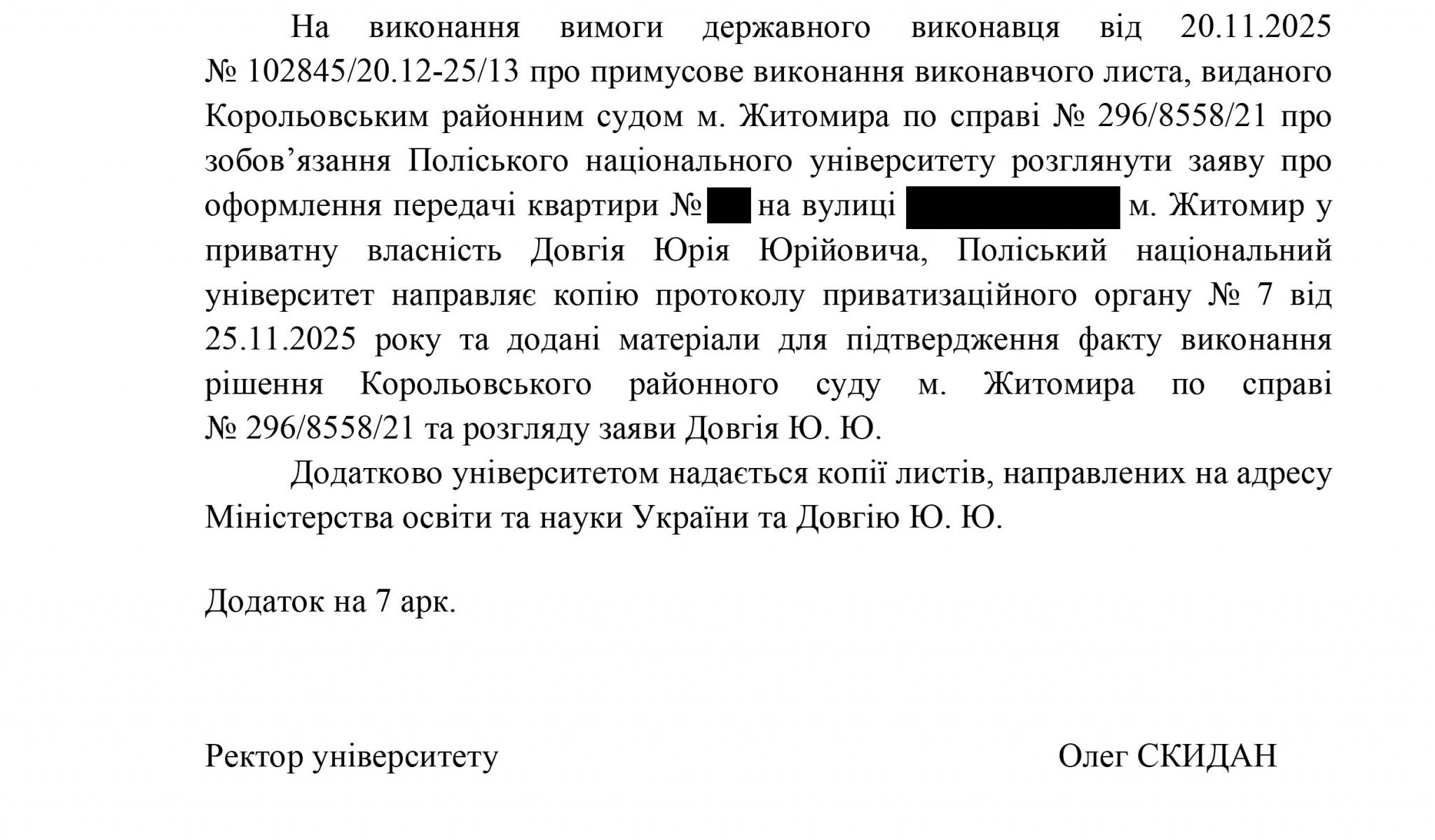 «На виконання вимоги державного виконавця від 20.11.2025 № 102845/20.12-25/13 про примусове виконання виконавчого листа, виданого Корольовським районним судом м. Житомира по справі № 296/8558/21 про зобов’язання Поліського національного університету розглянути заяву про оформлення передачі квартири № 46 на вулиці С. Ріхтера, 12, м. Житомир у приватну власність Довгія Юрія Юрійовича, Поліський національний університет направляє копію протоколу приватизаційного органу № 7 від 25.11.2025 року та додані матеріали для підтвердження факту виконання рішення Корольовського районного суду м. Житомира по справі № 296/8558/21 та розгляду заяви Довгія Ю. Ю.».