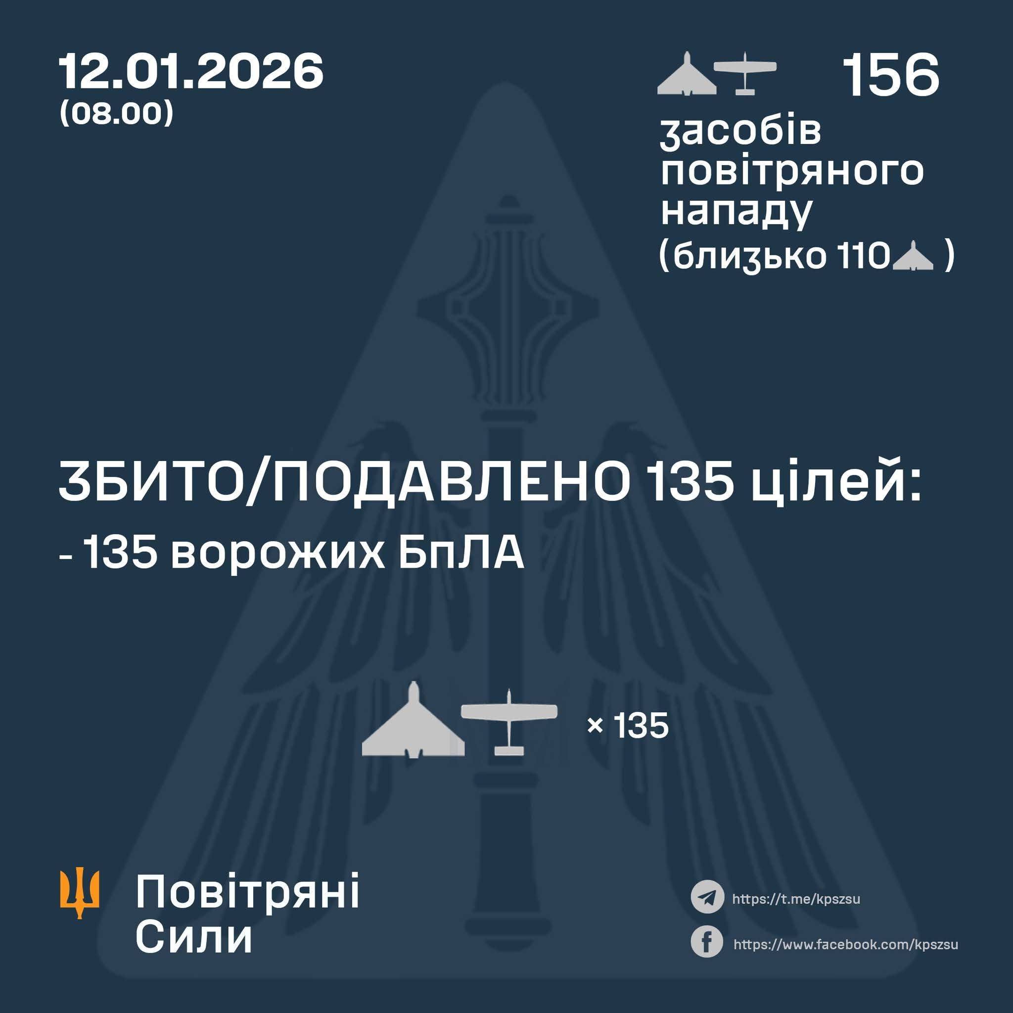 "За попередніми даними, станом на 08:00, протиповітряною обороною збито/подавлено 135 ворожих БпЛА типу Shahed, Гербера і дронів інших типів на півночі, півдні, сході та центрі країни.