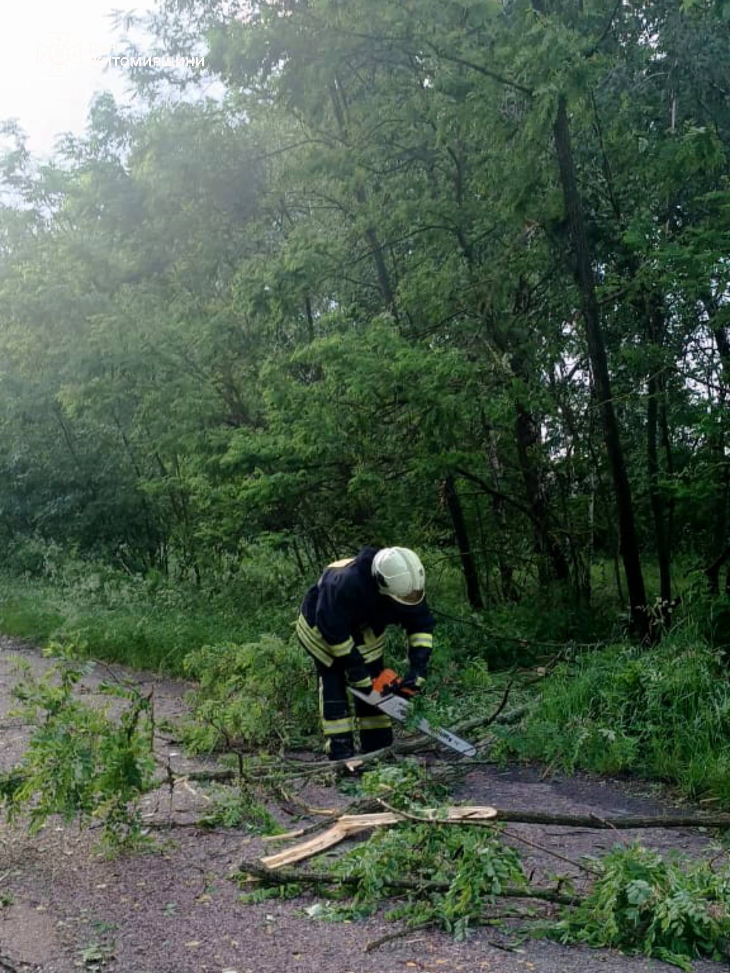 Зокрема, поблизу с. Остапи Лугинської громади впало на дорогу близько 50 дерев, які перекрили рух для транспорту та повалили 6 електроопор. Наші хлопці розрізали та розтягнули повалені негодою дерева і звільнили проїжджу частину.