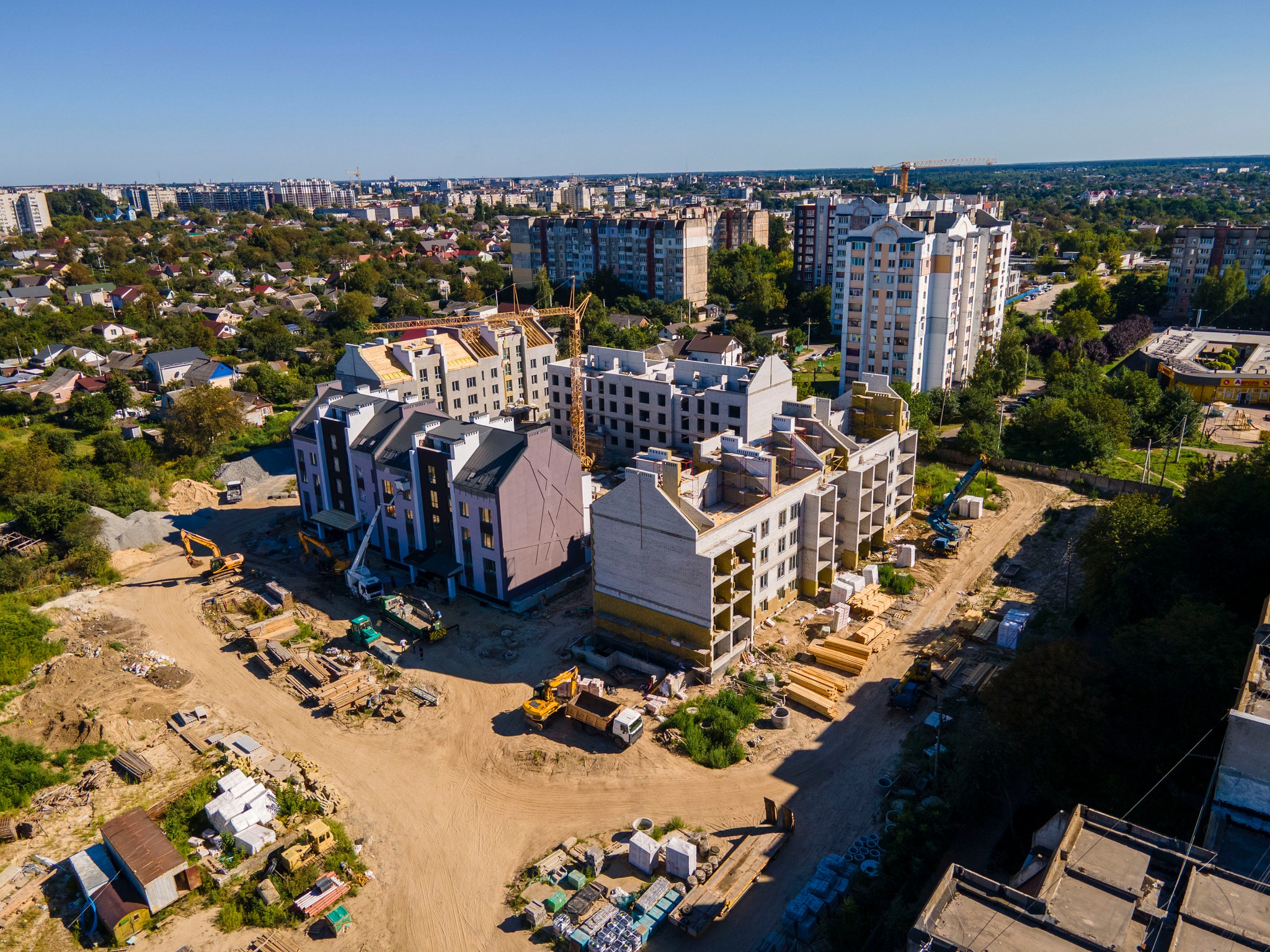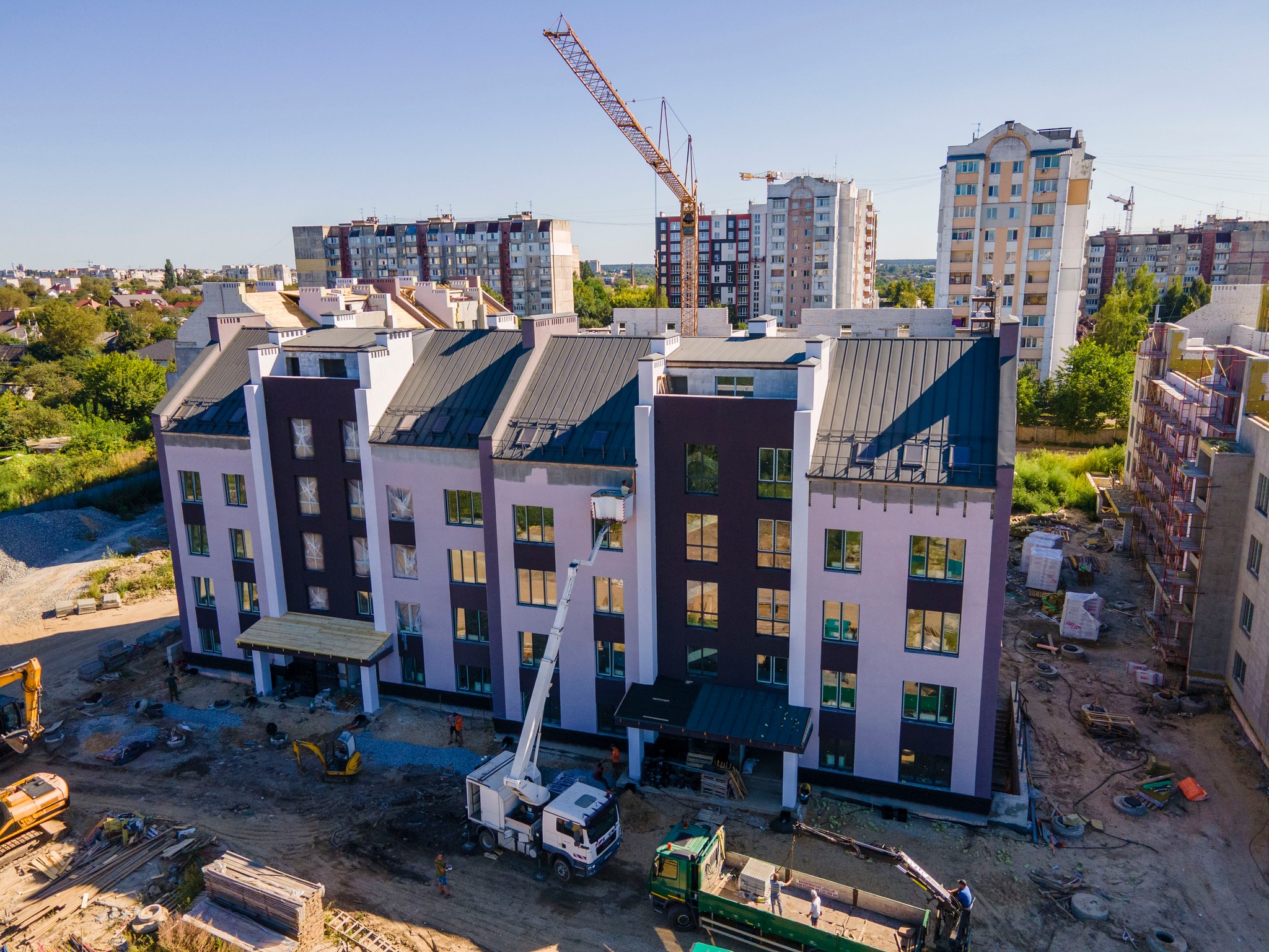 Станом на 6 жовтня 2025 року один будинок вже зведений, завершуються роботи зі зведення інших трьох будинків, тривають роботи з утеплення фасадів, монтаж покрівлі, вікон, а також внутрішні оздоблення у трьох будинках.