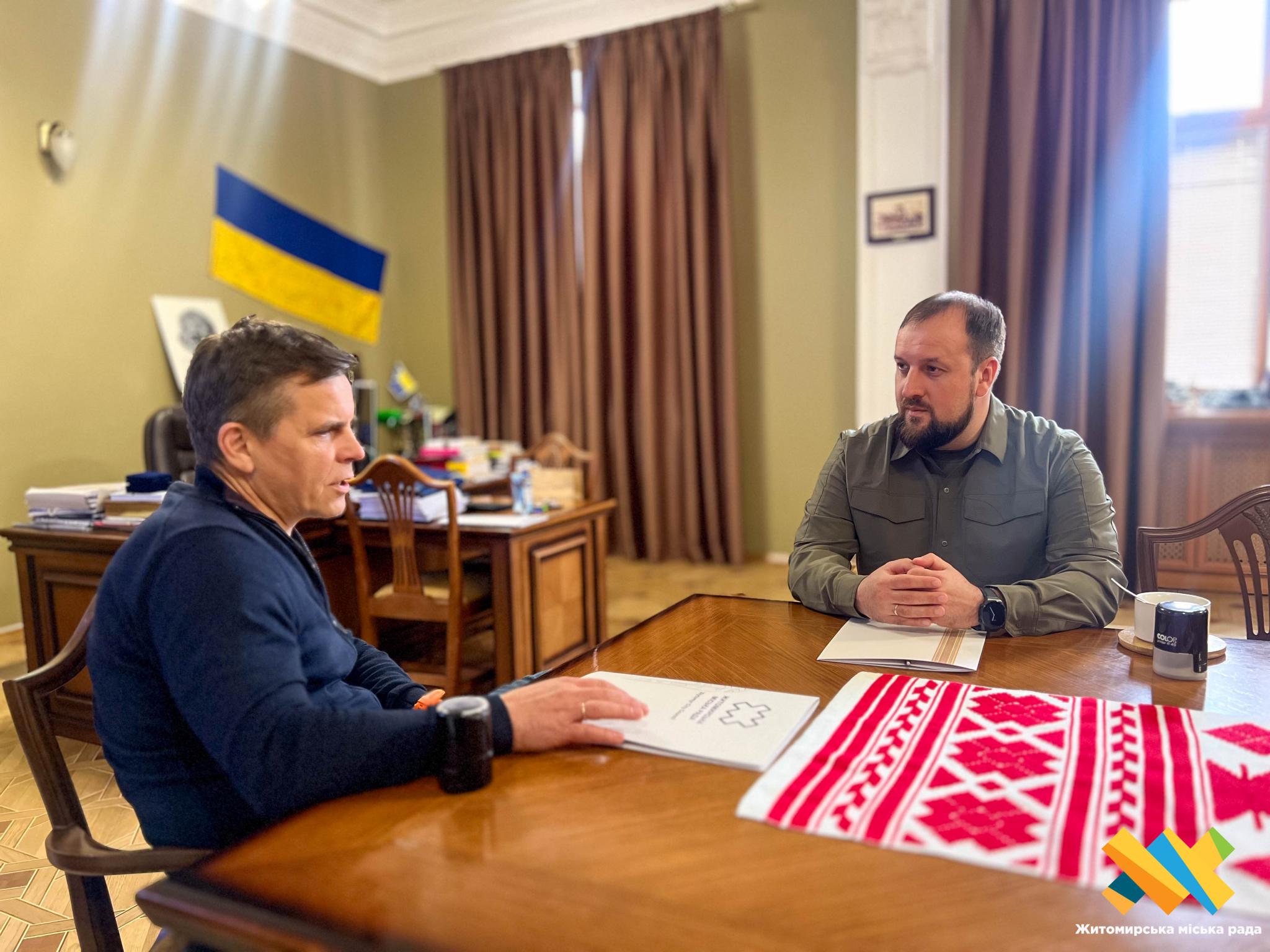 Під час зустрічі з Житомирським міським головою обмінялися прапорами. На Купʼянському — бабак. Після російського вторгнення символ міста було знищено. Але львівʼяни зробили новий, і тепер 600 кілограмовий красень захищає колись процвітаюче місто.
