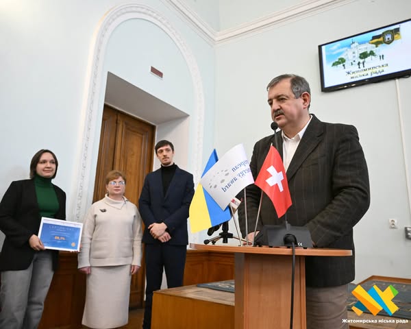 На пленарному засіданні Житомирської міської ради заступник керівника Програми співробітництва Посольства Швейцарської Конфедерації в Україні Сільван Хунгербюлер урочисто вручив громаді Житомира «Європейську енергетичну відзнаку» (ЄЕВ).