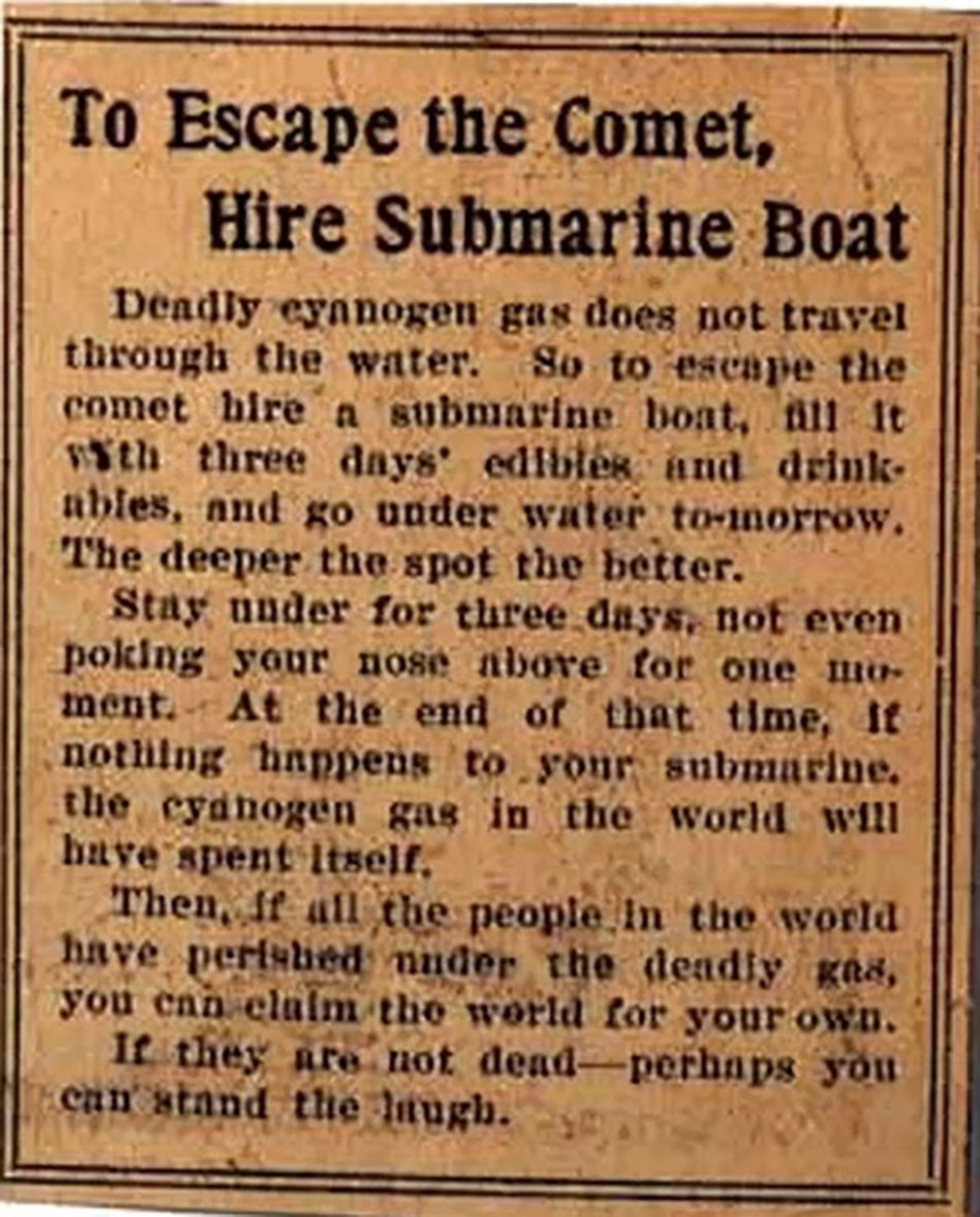 3. Точно не відомо, жартівлива це газетна замітка чи ні, проте у ній пропонується орендувати підводний човен на 3 дні, поки ціановий газ не розпорошиться. «А потім, якщо всі помруть, ви зможете проголосити світ вашим, а якщо не помруть, ну, напевно, посміятися».