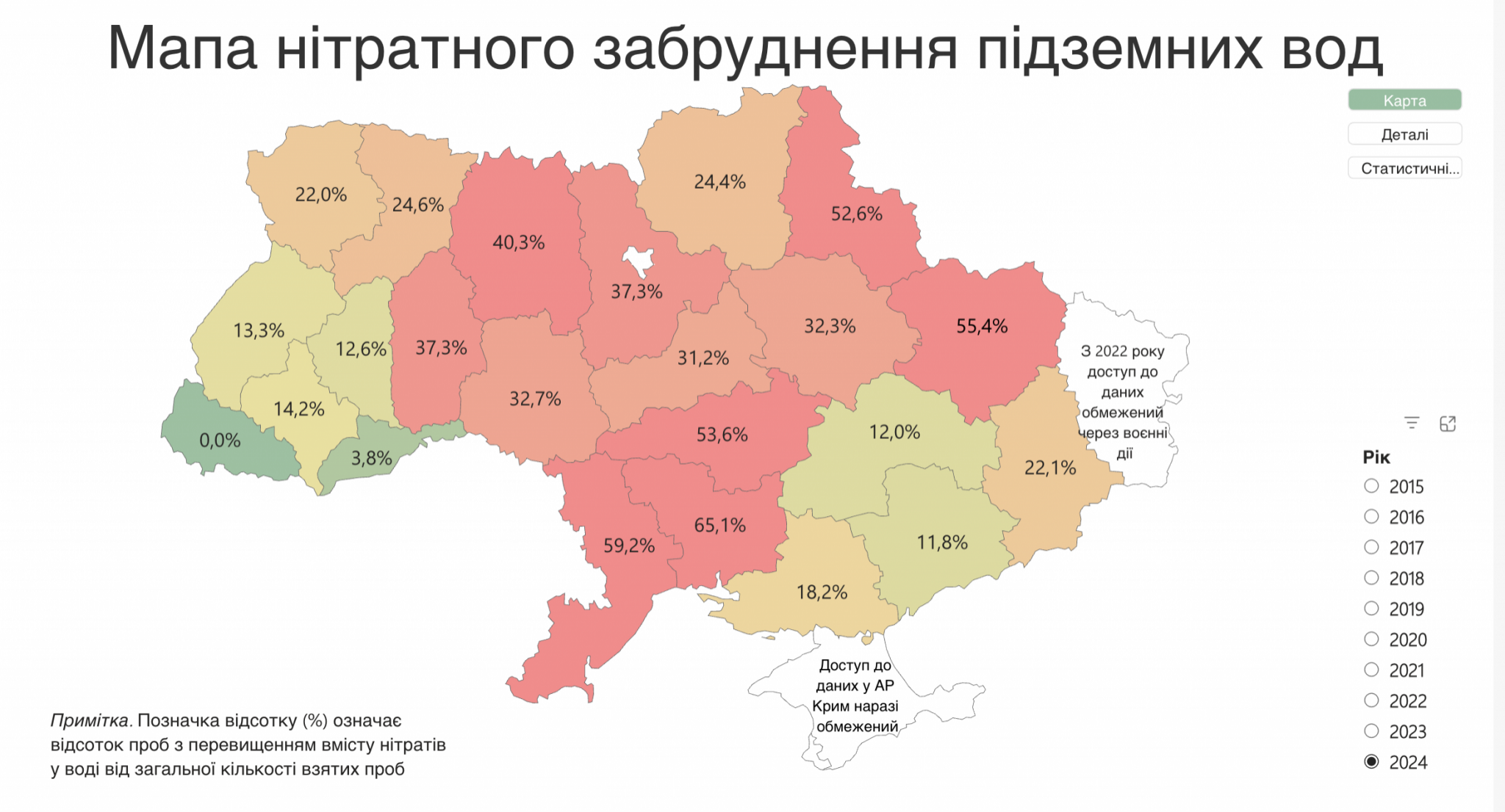 В Україні представили інтерактивну мапу нітратного забруднення підземних вод. Дані за 2024 рік свідчать, що в окремих регіонах більше половини проб води з колодязів та свердловин не відповідають санітарним нормам щодо вмісту нітратів.