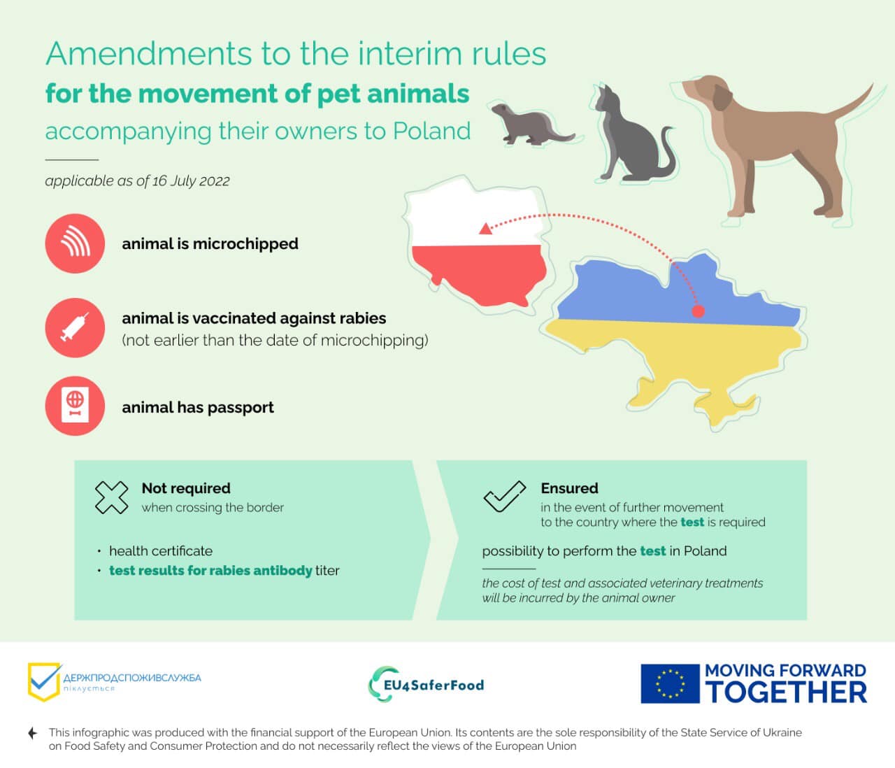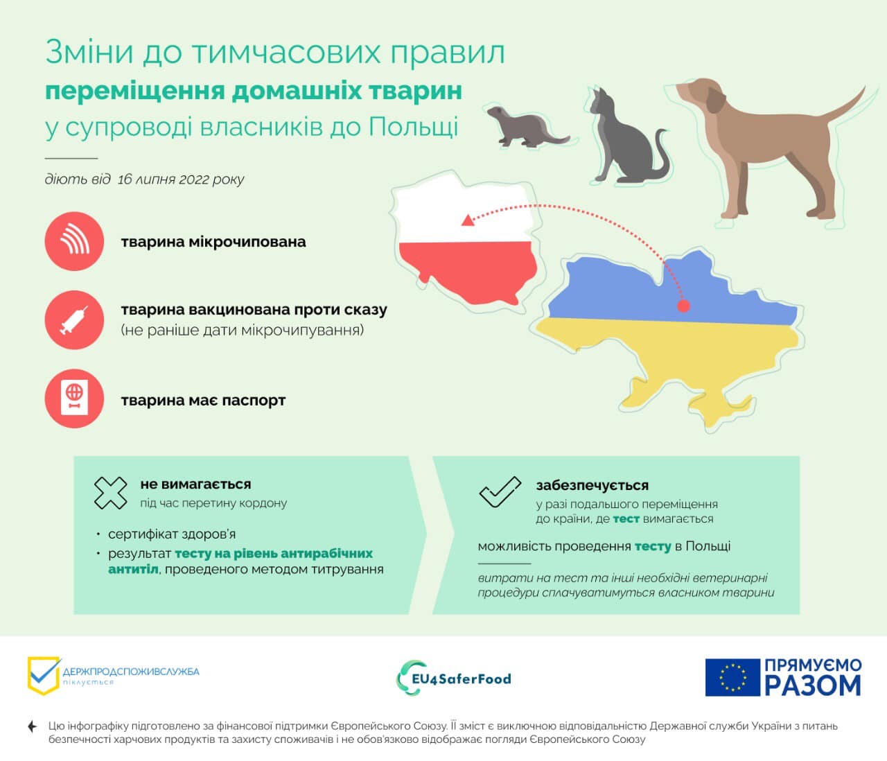 З 16 липня 2022 року ввезення домашніх тварин (коти, собаки та тхори) в супроводі їх власників або опікунів (уповноважені особи) на територію Республіки Польщі з України буде можливим за умови виконання наступних вимог: