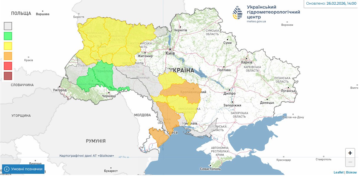 Мiсцями можливий початковий вихiд води на заплаву (І рівень небезпеки - жовтий). На рiчках відбуватиметься подальше послаблення та руйнування льодових явищ, мiсцями льодохiд.