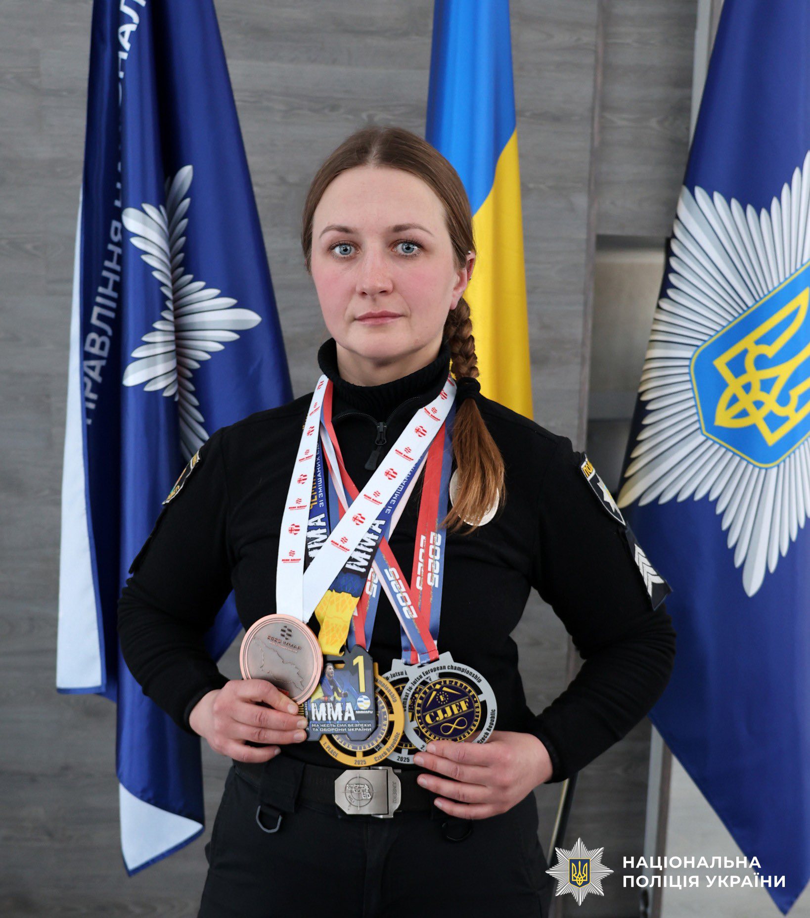 На початку березня у Броварах на Чемпіонаті України з комбат Дзю-Дзюцу поліцейська здобула три золоті медалі – в розділах full contact, close contact та ground fight. Кожен із них передбачає різний формат поєдинку: від ударної техніки в стійці до боротьби в партері. Перемоги забезпечили їй участь у Чемпіонатах Європи та світу.