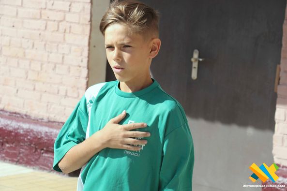 9-річний Назар Денисюк - нападник команди, що представляє ліцей № 3. Його команда грає сьогодні проти футболістів Початкової школи № 11 м. Житомира. З 6-ти років хлопець займається футболом у ДЮСШ "Академія футзалу". Каже, має кумира – французького футболіста Кіліа́на Мбаппе́ .