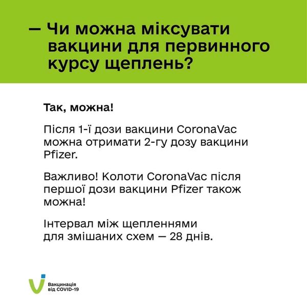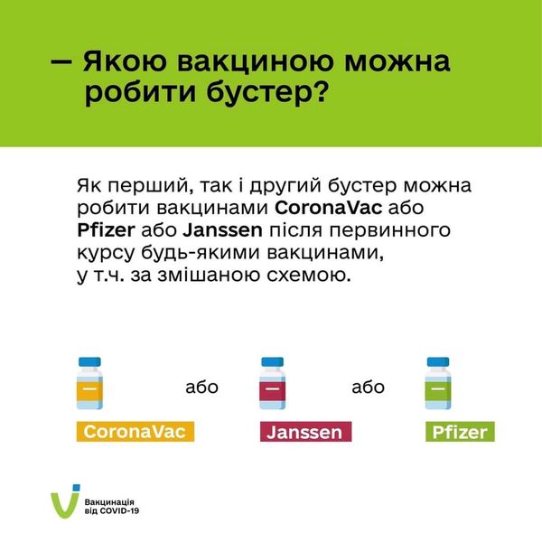 Тобто, якщо людина отримала базовий курс вакциною Comirnaty, Moderna чи будь-якою іншою вакциною, вона може отримати бустерне щеплення (як перше, так і друге) вакциною CoronoVac. Ці схеми вакцинації, окрім того що безпечні, ще й захищають від госпіталізації та ризиків смерті внаслідок коронавірусної хвороби.
