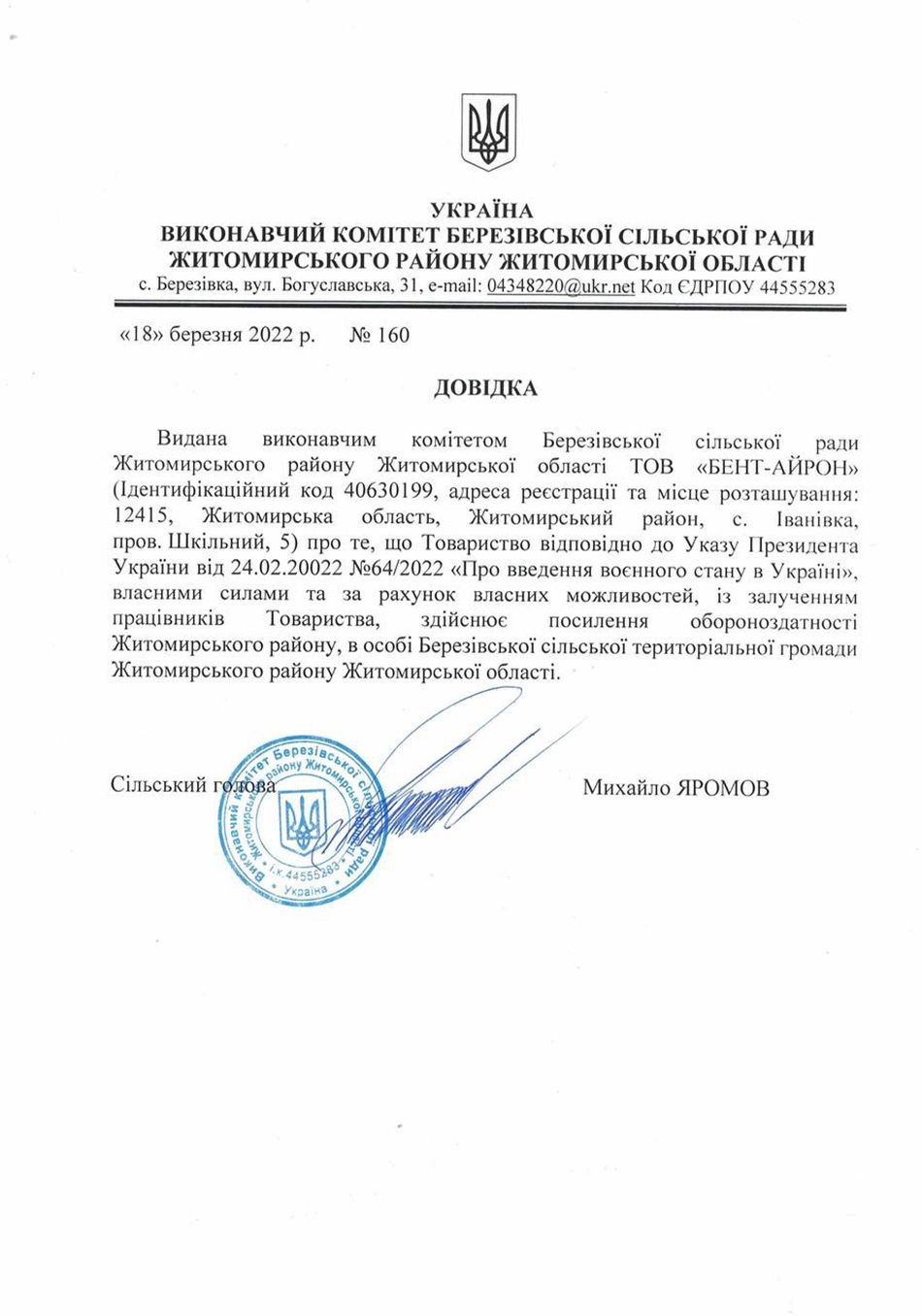 Фірма «Бент-Айрон» на даний час знаходячись в с. Іванівка, надає величезну допомогу підрозділам територіальної оборони, місцевій владі, виготовляючи за власний рахунок металеві вироби для потреб як військових, так й територіальної громади. Зокрема це штучні вироби на кшталт «їжак», металеві перепони для руху транспорту та ряд інших.