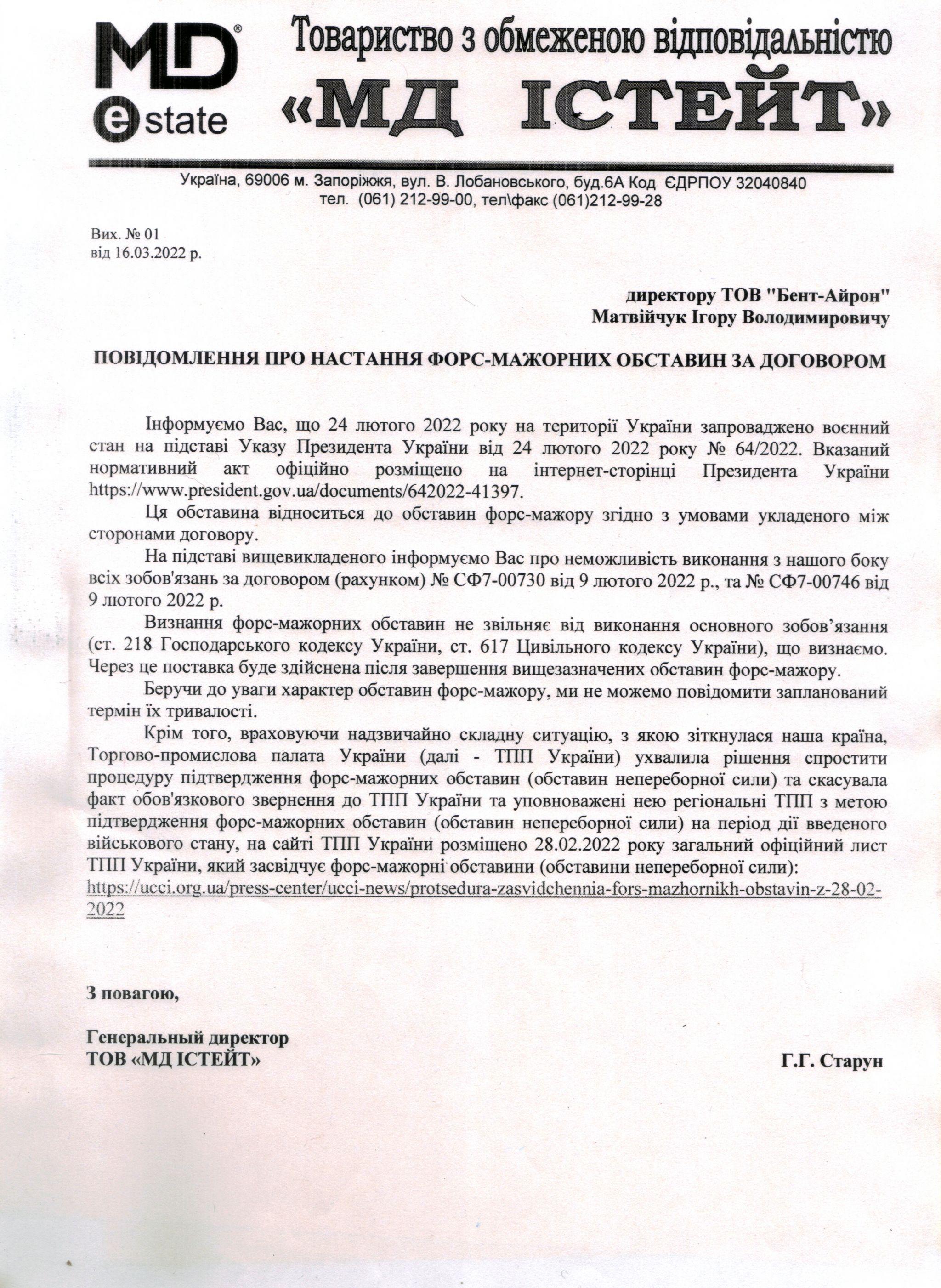 ТОВ «МД ІСТЕЙТ» відповідними документами підтвердило, що кошти були отримані ще на початку лютого 2022 року та метал є в наявності. Після повномасштабного вторгнення Росії в Україну український уряд звернувся до представників українського бізнесу підтримати економіку України та продовжити виконувати зобов’язання за попередньо укладеним угодам. Але всупереч цьому, ТОВ «МД ІСТЕЙТ» відмовилося від власних зобов’язань та надіслало «Повідомлення про настання форс-мажорних обставин за договором», відповідно до якого заявило, що не може відвантажити товар, тобто метал, який вже знаходиться на території вантажного майданчику в м. Житомирі, посилаючись на ст. 218 Господарського Кодексу України та ст. 617 Цивільного Кодексу України, але визнаючи право отримати вантаж після завершення форс-мажорних обставин.