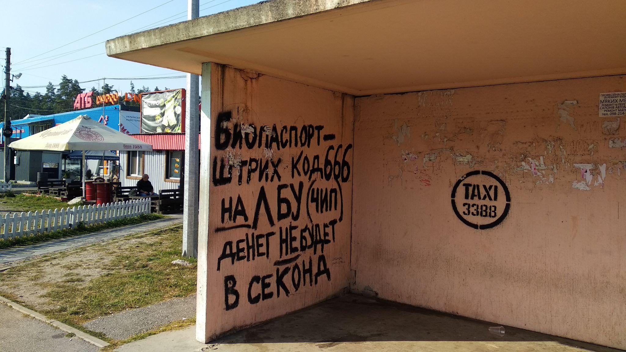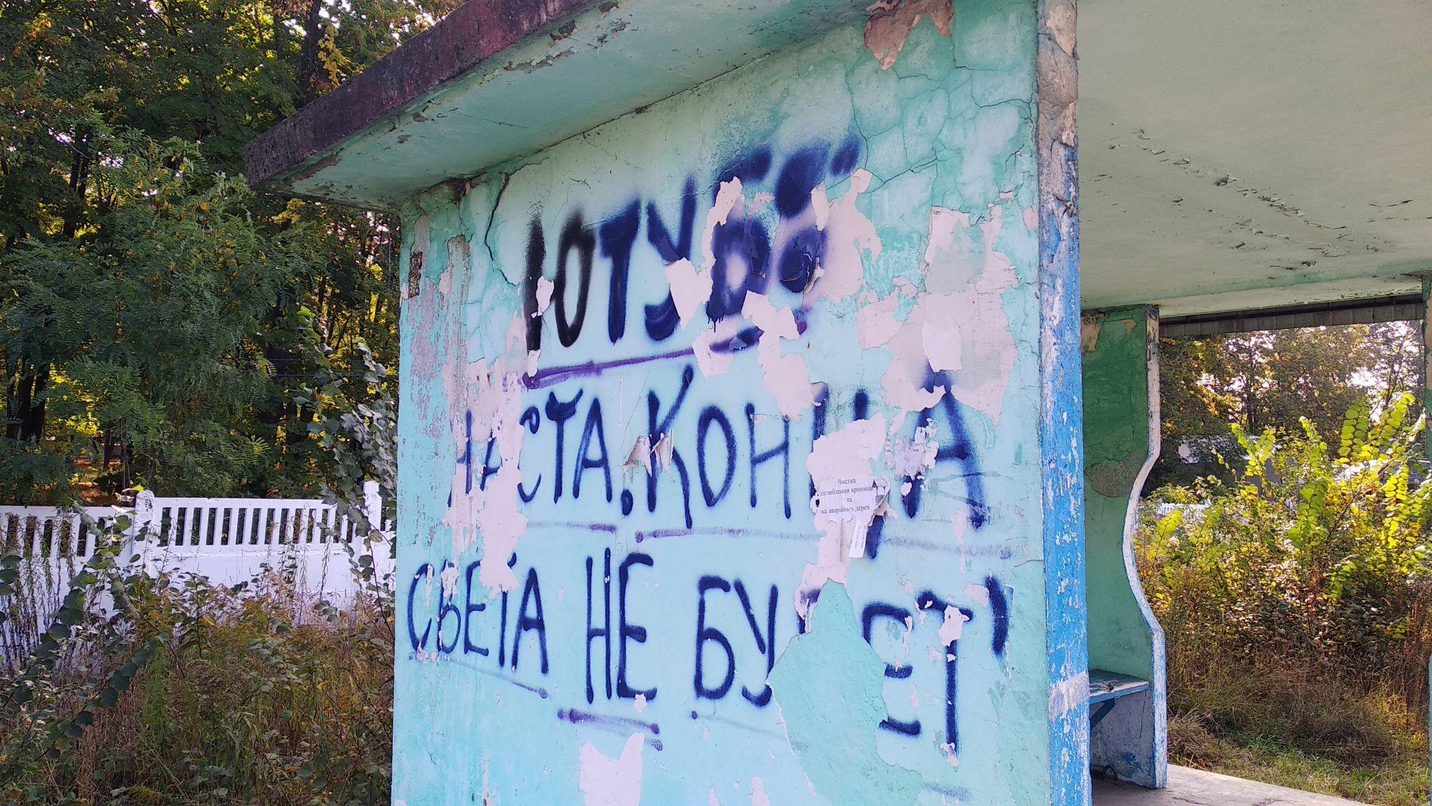 На фото можна побачити який вигляд мають зупинки біля обласної психіатричної лікарні у Житомирі після нанесення «графіті» прихильниками секти «анастасійців».