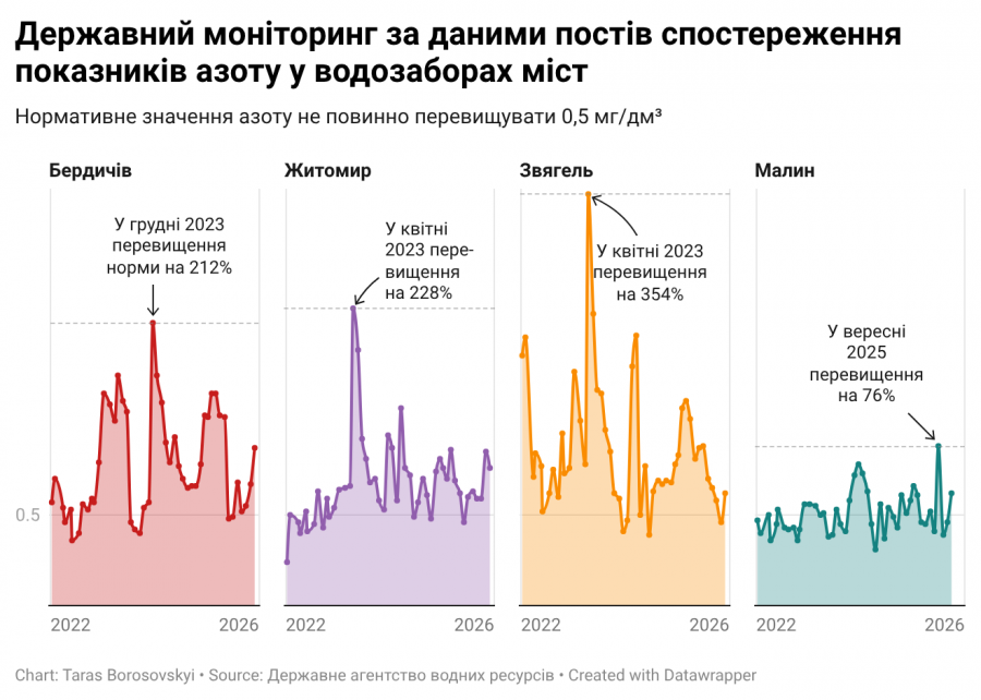 Ще більш кричущими є результати моніторингу на загальний вміст азоту у питній воді. За рідким виключенням його вміст у певних місяцях був у допустимих межах. І хоча знову ж таки у Малині ситуація краще за інші міста, у вересні 2025 року вміст азоту на 76% навіть тут перевищив базову норму. У 2023 році у Бердичеві та Житомирі його концентрація була вдвічі вищою, а у Звягелі - навіть втричі! Така різка зміна якості води може свідчити про прямі скиди неочищених або недостатньо очищених стічних вод.