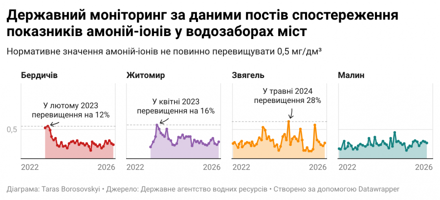 У лютому 2023 року вміст амоній-іонів у питному водозаборі Бердичева перевищував норму на 12%. Двома місяцями пізніше, у квітні 2023 року на 16% перевищення зафіксоване у водозаборі Житомира. При цьому за увесь 2022 рік результати моніторингу по обом містам відсутні. Та найбільше забруднення амоній-іонами зафіксовано на пункті моніторингу питної води у Звягелі. У травні 2024 року їх вміст на 28% перевищував норму.