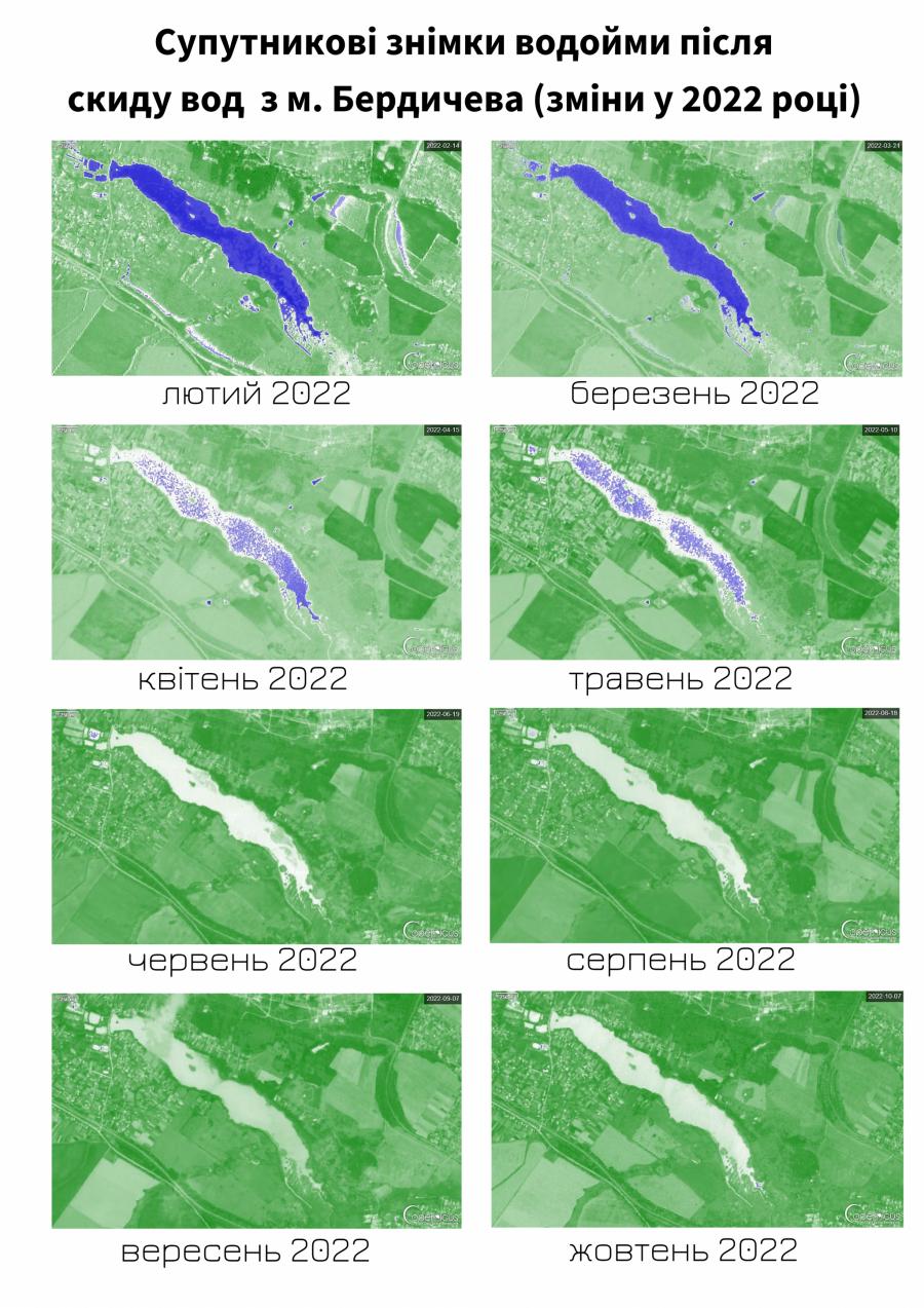 Для дослідження річок Житомирської області ми скористалися супутниковими знімками, доступні на міжнародному дослідницькому проекту Copernicus. Застосувавши до завантажених зображень нормалізований диференційний індекс каламутності, ми виявили чітку тенденцію до різкого погіршення стану поверхні річки Гнилоп’ять нижче скидів міста Бердичева.