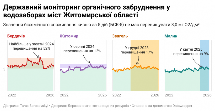 У Житомирі та Звягелі біохімічне споживання кисню (БСК-5), яке про це сигналізує, переважно було вище норми. У Малині, де ситуація була кращою, з жовтня 2025 року також не відповідає державним вимогам. Але найгірша ситуація в Бердичеві. За чотири роки, починаючи з лютого 2022 року, питна вода у Бердичівському водосховищі постійно мала вищі (інколи у півтора рази) за максимально допустимі значення біохімічного споживання кисню. У свою чергу це свідчить про системне забруднення та нездатність річки до самоочищення.