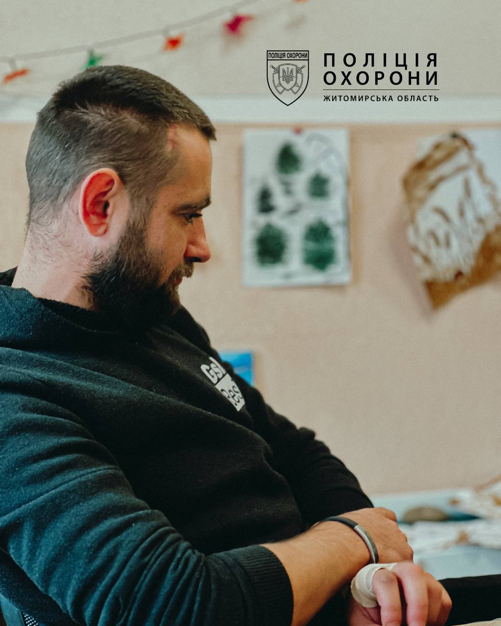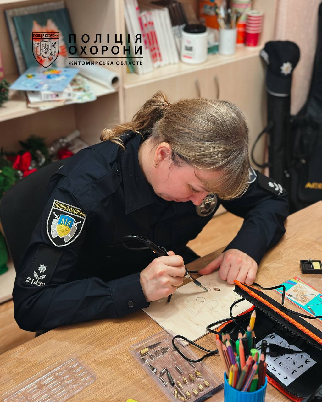 «Випалювання по дереву — це не просто творчий процес, а спосіб прожити й відпустити емоції, які часто важко висловити словами. Через концентрацію на лінії, візерунку та теплі вогню людина заспокоюється, зосереджується на теперішньому моменті й поступово повертає внутрішню рівновагу. Для наших поранених захисників такі заняття — це можливість відновити контакт із собою, відчути підтримку та віру у власні сили», — підкреслила майор поліції Ольга Капалб психолог Управління поліції охорони в Житомирській області.