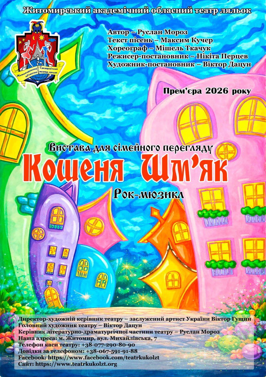 Театр очолює заслужений артист України Віктор Гущин, який обіймає посаду директора-художнього керівника. Для всієї родини «Кошеня Шм’як» — це вистава для сімейного перегляду. Вона однаково захопить дітей, які мріють про сцену, і дорослих, які пам’ятають, як важливо вчасно повірити у себе. Прем’єра відбудеться у приміщенні театру за адресою: м. Житомир, вул. Михайлівська, 7.
