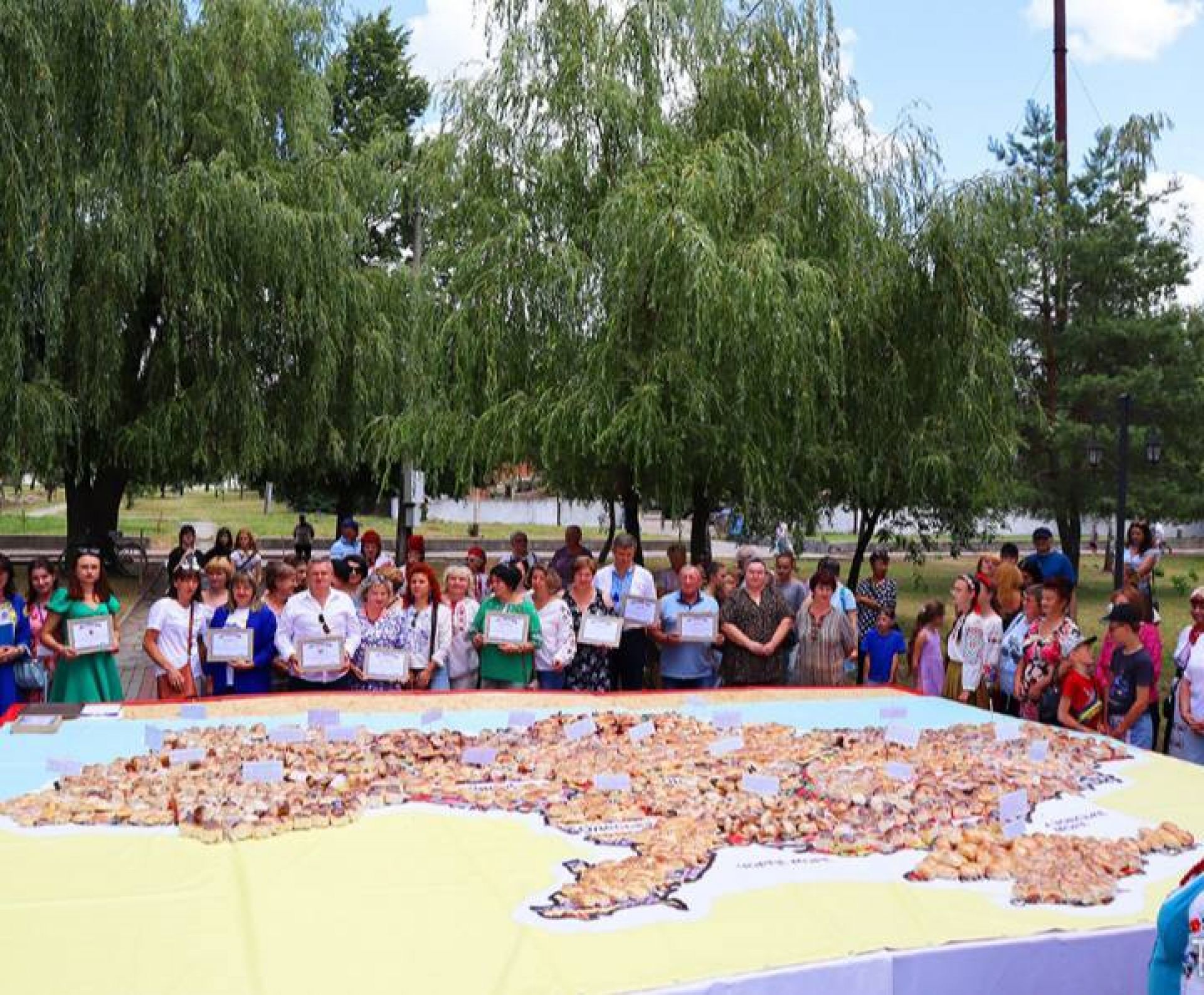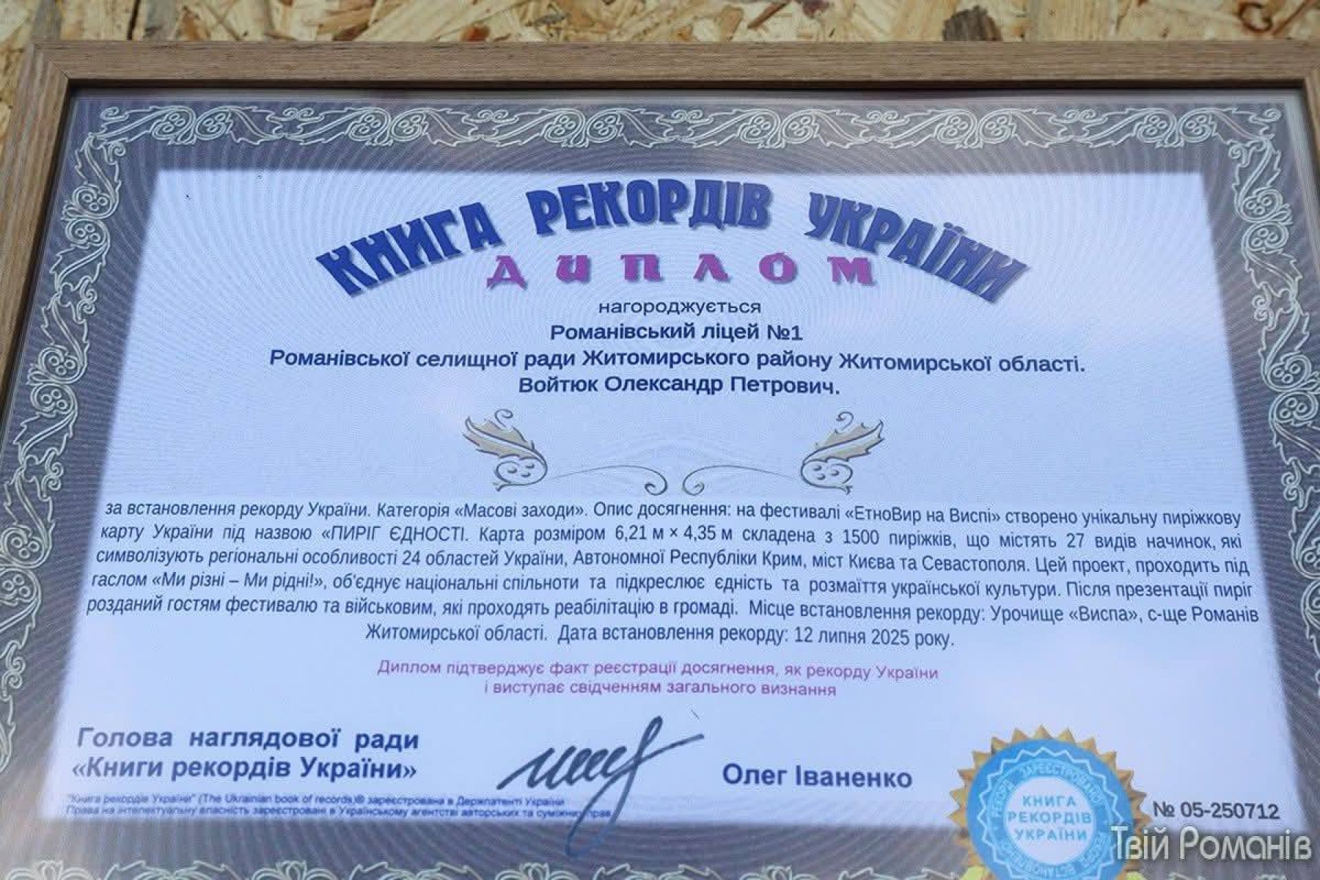 А тепер ще раз – про все і по порядку. Фестивальне гасло нинішнього «ЕтноВиру» звучало як «Ми різні – ми рідні». Звісно, організатори фесту розраховували на куди ширше представництво делегацій національно-культурних товариств, що давно заявили про свою діяльність на Житомирщині. Однак через дуже поважні причини та обставини представники більшості таких товариств на фест у Романові прибути не змогли. Якщо конкретніше, більшість таких активістів взагалі перебувають нині за межами України. Отож фестивальну нитку братерства, єдності та солідарності усіх регіонів України втілював інший проєкт, який дуже вдало, неймовірно тепло і переконливо підкреслив головне гасло нинішнього дійства – «Ми різні – ми рідні!» Ба більше, якраз пиріг єдності, який прикував увагу більшості гостей фестивалю, став найбільш резонансною родзинкою фесту у Романові, оскільки саме тут під час заходу відбулася фіксація нового рекорду в Україні. А рекордним витвором, який приніс «ЕтноВиру на Виспі» справді масштабної слави в межах всієї України, став пиріг єдності у вигляді велетенської карти України розміром 6,21 Х 4,35 метра, де розмістилися 1500 пиріжків із 27-ми видами найрізноманітніших кулінарних начинок. Цифра 27 тут означала єдність 24-х областей України, її Автономної Республіки Крим, міст Києва та Севастополя. Зауважимо, що усі інгредієнти для випічки пирога національної єдності надали місцеві підприємці-благодійники. Ну а самі пиріжки випікалися у шести освітянських установах Романівщини. Якраз тим, хто випікав півтори тисячі пирогів, вручалися грамоти, сертифікати від імені Наглядової ради «Книги рекордів України». Ось так вже на другому році свого творчого життя фестиваль «ЕтноВир на Виспі» зайняв почесне місце і отримав рейтинг всеукраїнського масштабу. Це така собі деталь фестивального свята, однак вона багато про що свідчить.