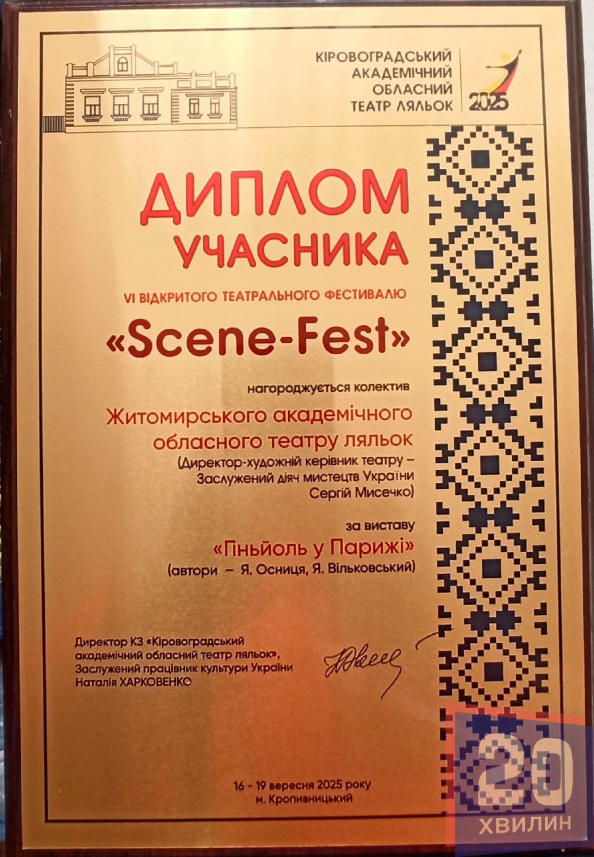 З великою гордістю і радістю сповіщаємо нашим дорогим глядачам і друзям: Житомирський академічний обласний театр ляльок блискуче представив оновлену прем’єру «Гіньйоль у Парижі» на VI Відкритому театральному фестивалі Scene-Fest, який відбувся 16–19 вересня 2025 року у місті Кропивницький.