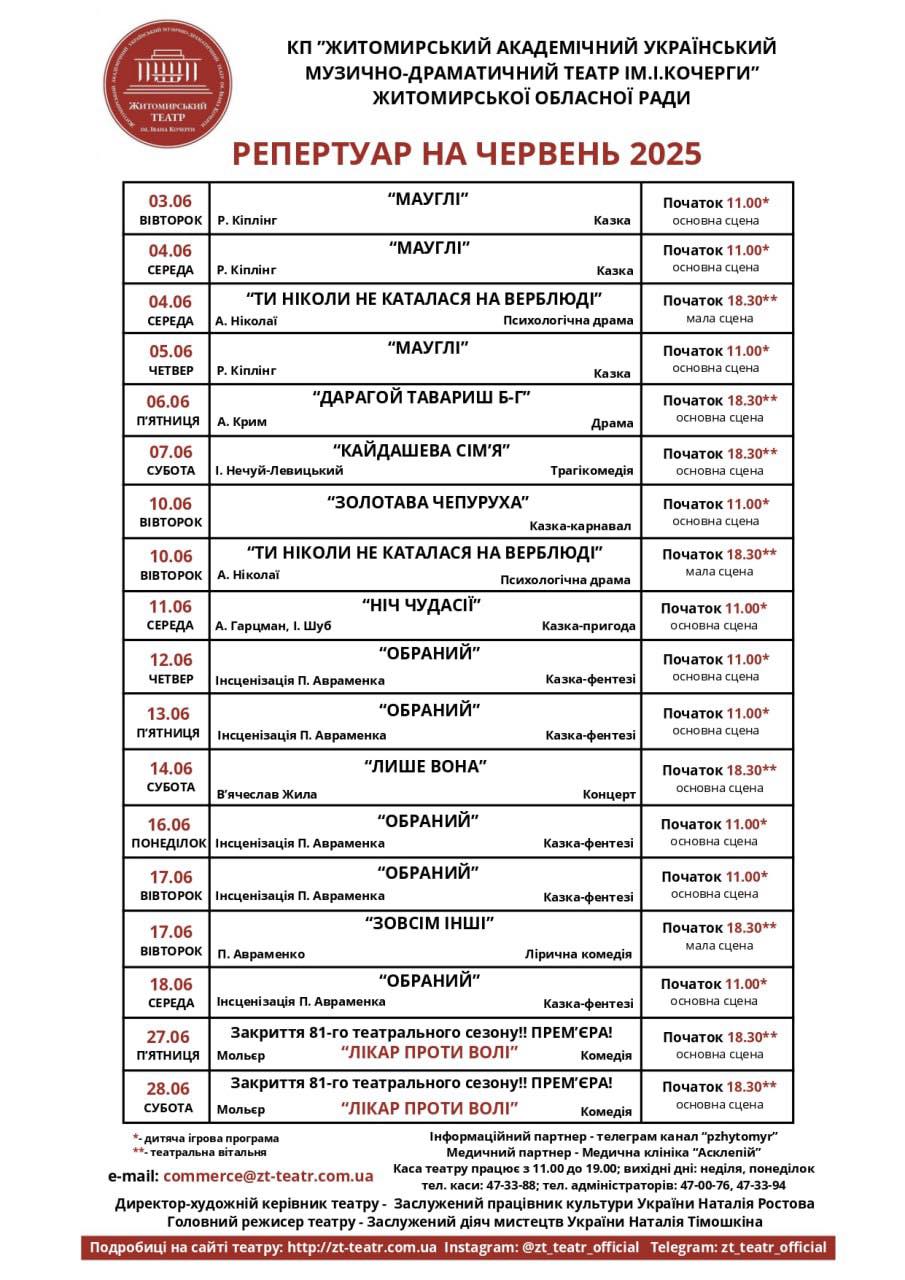 Житомирський академічний музично-драматичний театр ім. Івана Кочерги запрошує не вистави червня!