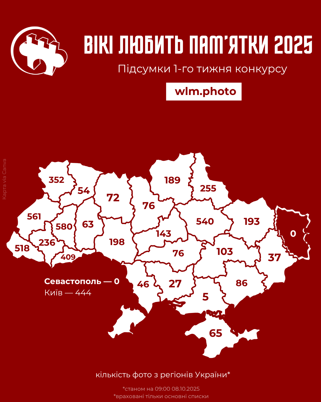 З 1 жовтня понад 75 учасників та учасниць завантажили більше 6 тисяч фотографій пам’яток України. У загальному рейтингу з 53 країн, що беруть участь цього року, Україна зараз ввійшла до десятки за кількістю завантажень. На першому місці — Польща з понад 30 тисячами фото.