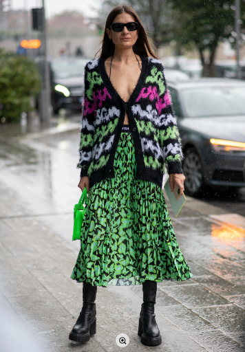 Міксуйте кардиган нейтрального кольору з яскравими юбками чи штанами. Особливе місце в образі слід відвести різноманітним аксесуарам: берету, високим шкарпеткам та структурованій сумці.